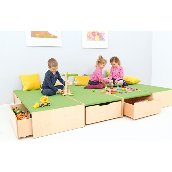 Mit den Podesten wird zusätzlicher Stauraum geschaffen. Die grossen, ausziehbaren Schübe sind sicher unter dem Podest verstaut, während darauf gespielt werden kann. Verbindungsklammern verhindern das Verrutschen zweier Podeste, sie sind nicht im Set enthalten. Schübe mit 4 versenkten Rollen (Ø 3 cm) - 2er-Set 126537 oder 1 Stck. 126541 - separat zu bestellen.