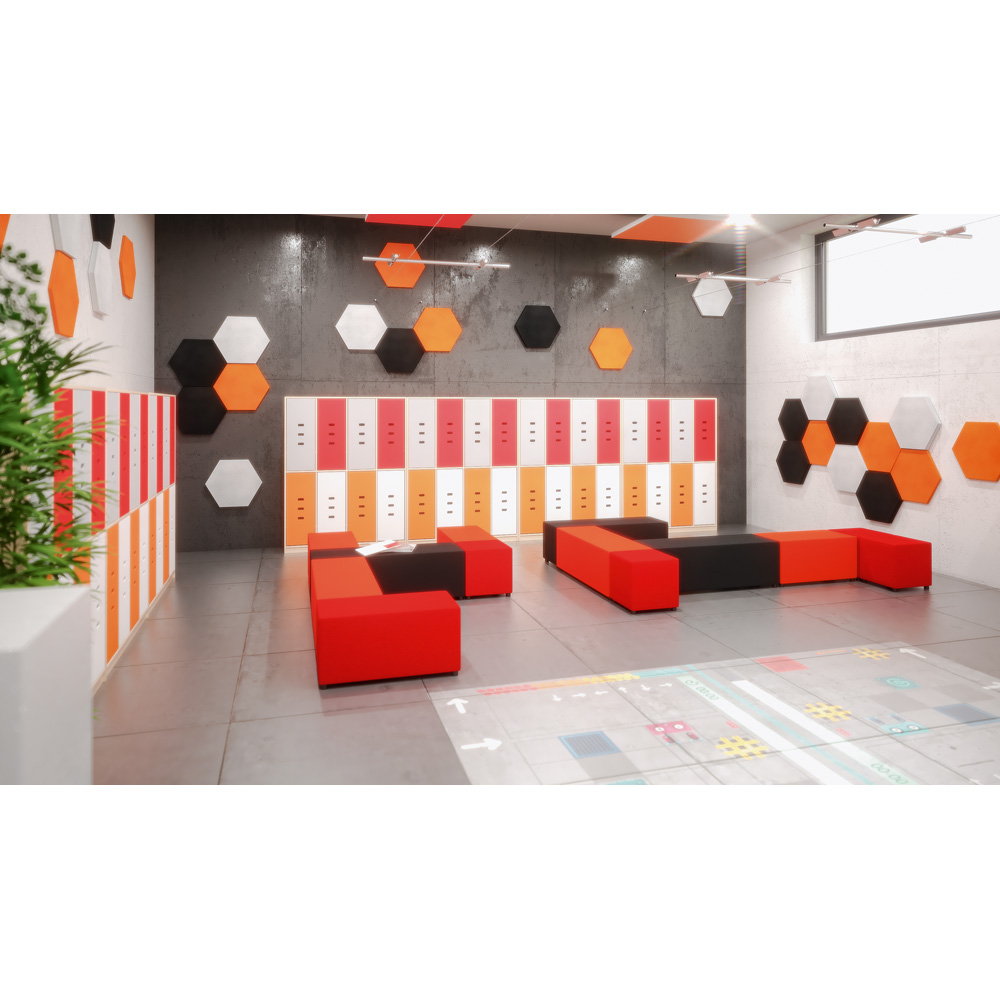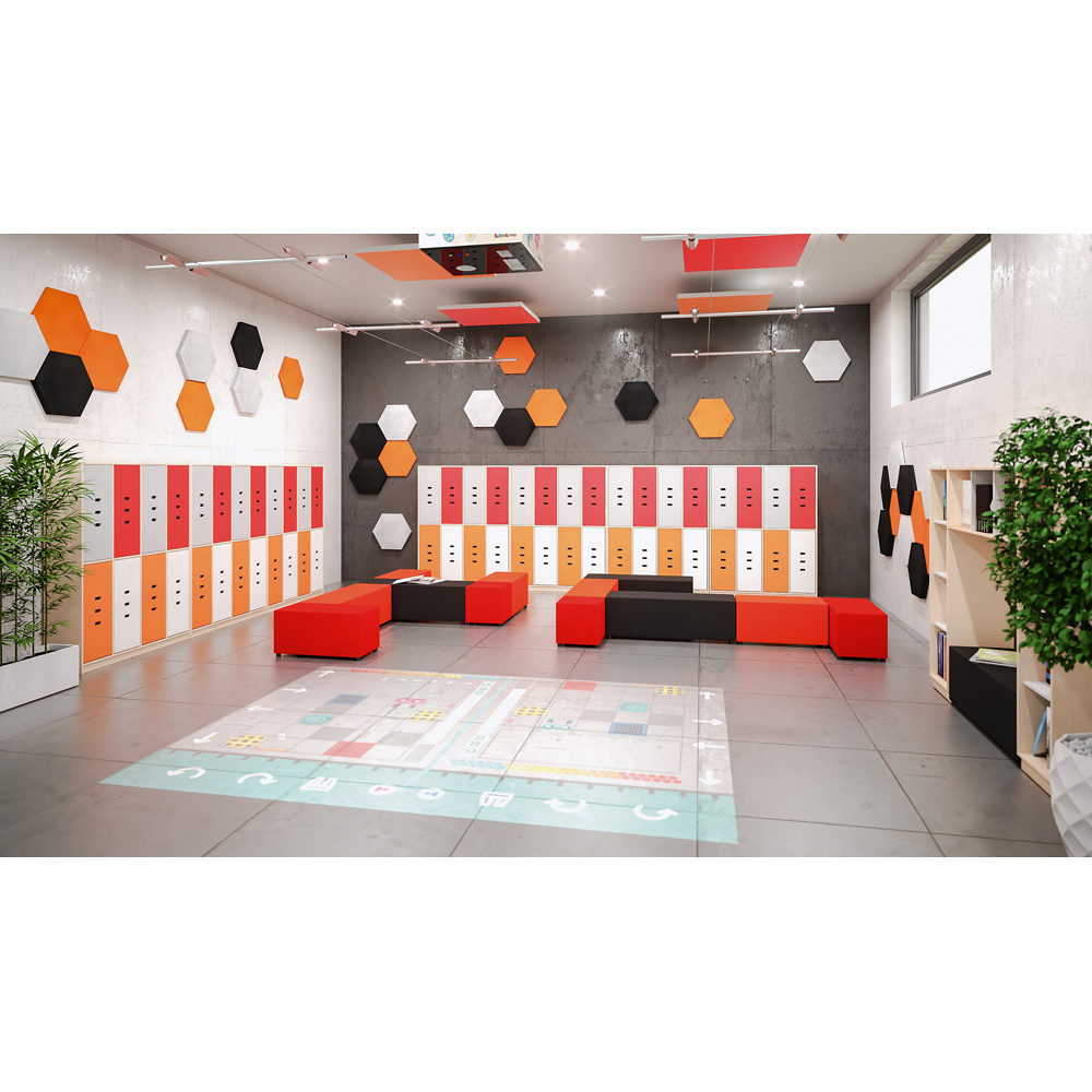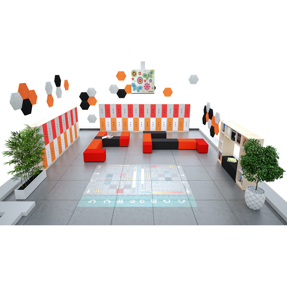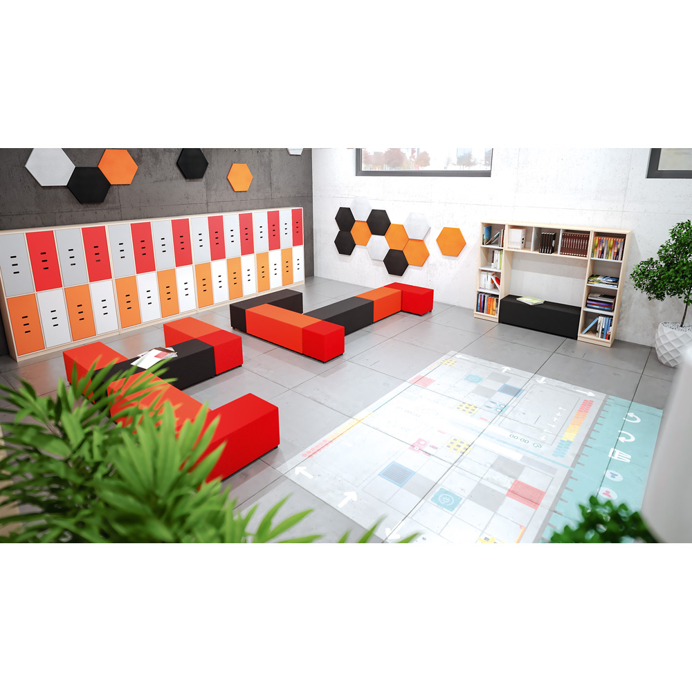 Die Bücherecke bietet alles, was kleine Leseratten brauchen: viel Platz für grosse und kleine Lieblingsbücher und dazwischen einen Bereich, in dem sie es sich gemütlich machen und sich ganz ungestört in ihre Lektüre vertiefen können. Zwischen die Aussenregale passen Sitze und Kissen (z.B. 101347-101351, 101357-101366, separat bestellbar), auf denen sich gemütlich schmökern lässt. Eine dimmbare und farblich regulierbare LED-Leuchtleiste sorgt für die richtige Stimmung.