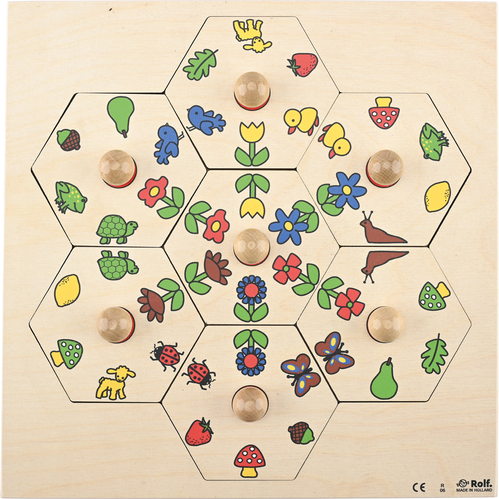 Nach Farben oder Bildern kann das pädagogische Puzzle zusammengesetzt werden. Jedes Puzzleteil hat einen grossen runden Griff in der Mitte, damit es in kleine Hände passt.