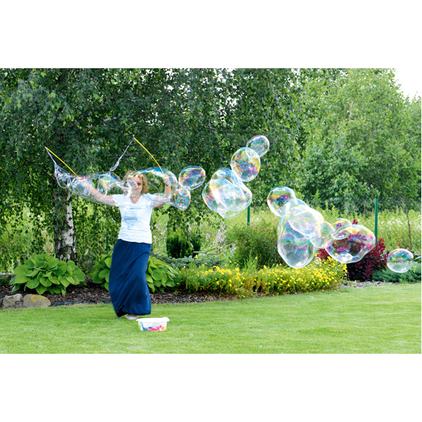 Riesenseifenblasen kinderleicht gemacht. Schnur einfach in Seifenblasenflüssigkeit eintauchen und auseinanderziehen.