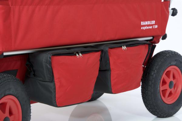 Die beiden Seitentaschen hängen unter den Bänken zwischen den Rädern und bieten erstaunlich viel Stauraum. Praktisch für Windeln, Baby-Feuchttücher und Verbandskasten.