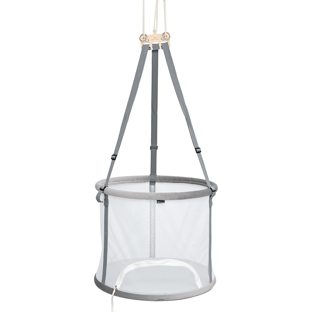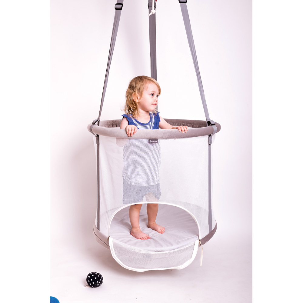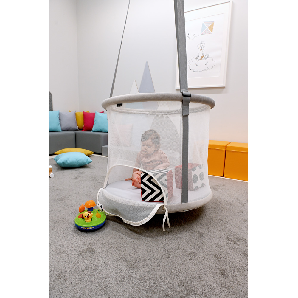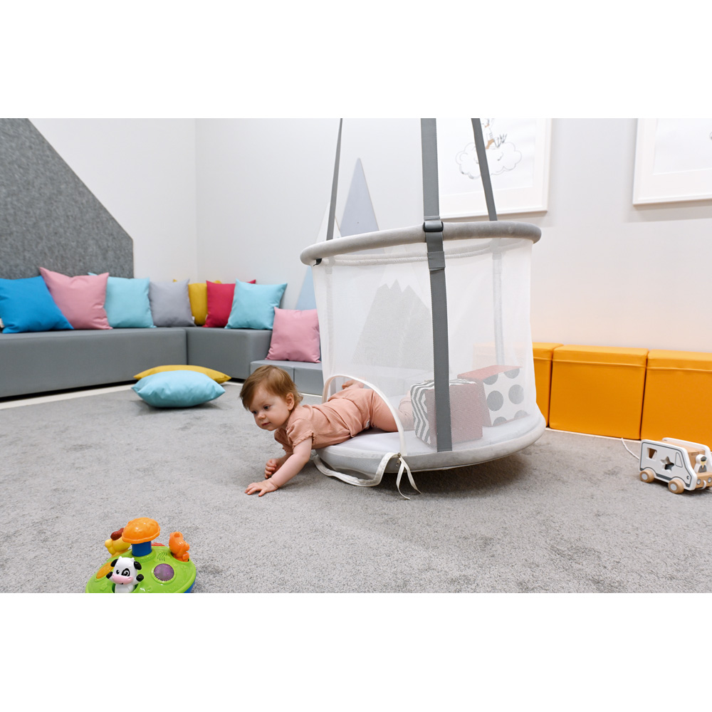Ein Hängekorb als sicherer Ort zum Spielen und Entspannen. Der Korb schwingt flach über dem Boden und wiegt das Kind sanft hin- und her. So kann es gut zur Ruhe finden. Durch die ständige Bewegung trägt der Korb aber auch gezielt zur Entwicklung der Körperwahrnehmung und Förderung der sensorischen Integration bei. Das Kind nimmt Lageveränderungen wahr und muss seinen Körper beständig ausbalancieren. Durch die feine Gaze kann das Kind zugleich seine Umgebung ringsum wahrnehmen und Sie haben es stets im Blick. Ein Eingang, der sich per Reissverschluss öffnen lässt, ermöglicht es dem Kind, selbstständig und frei ein- und auszusteigen. Beim Einsteigen in den leicht wippenden Korb muss das Kind gleichzeitig das Gleichgewicht halten und versuchen, den Korb zu halten. Auf diese Weise trainiert es auch Koordination und Motorik und stärkt die Muskeln. Und nicht zuletzt macht Schaukeln einfach Spass, vor allem weil das Kind den Korb durch eigene Gewichtsverlagerung in Bewegung setzen kann. Mit bunten Bällen lässt sich der Hängekorb sogar zum Ballbad umfunktionieren.