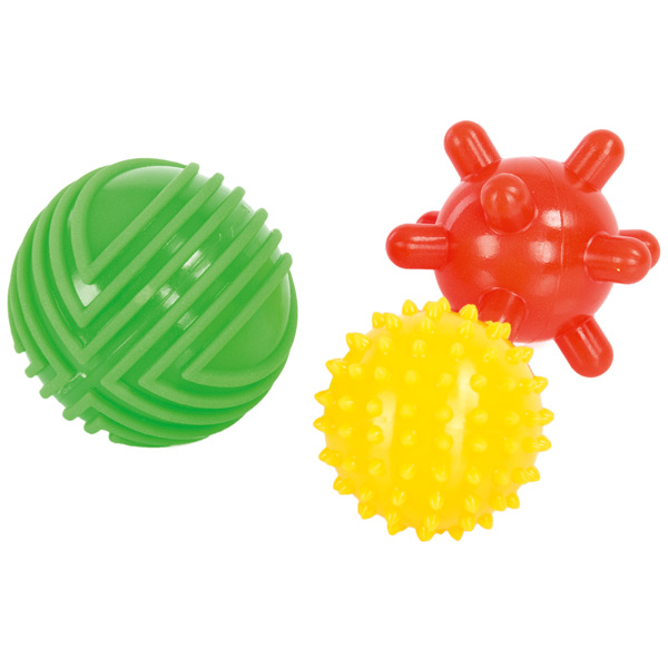 Ideal zum Spielen und für verschiedenste Übungen. Diverse Oberflächenstrukturen und Farben fördern Auge-Hand-Koordination und Tastwahrnehmung. Einige Bälle klingeln bei Bewegung, dies stimuliert zusätzlich das Gehör. Man kann sie werfen, rollen, quetschen - und sogar als Zahnungshilfe nutzen. • 3 Stck. • Durchmesser: 6 - 8 cm