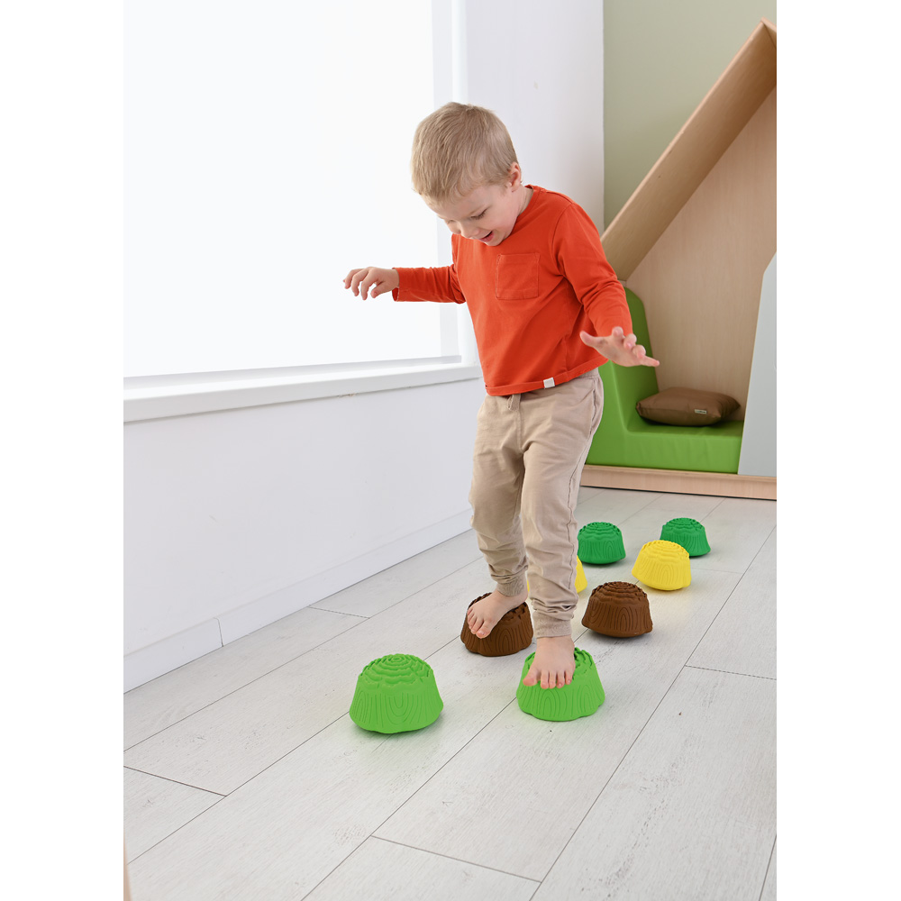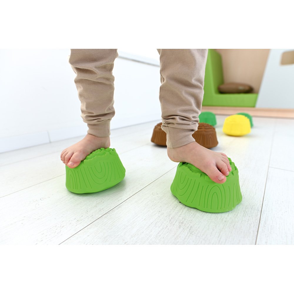 Das Set aus 8 strukturierten, farbenfrohen Balancierfüssen unterstützt das Gleichgewichtstraining. Sie haben ein rutschfestes Muster auf der Unterseite.