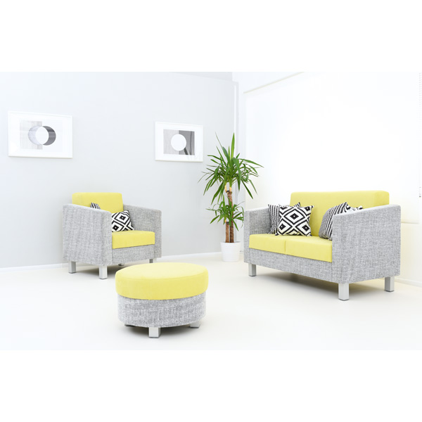 Bequemes, robustes Sitzmöbel mit stabilem Holzgestell und Schaumstofffüllung. Bezug in origineller Gewebekombination aus Oslo-Velours. Metallbeine alufarben mit Kunststoffgleitern.
