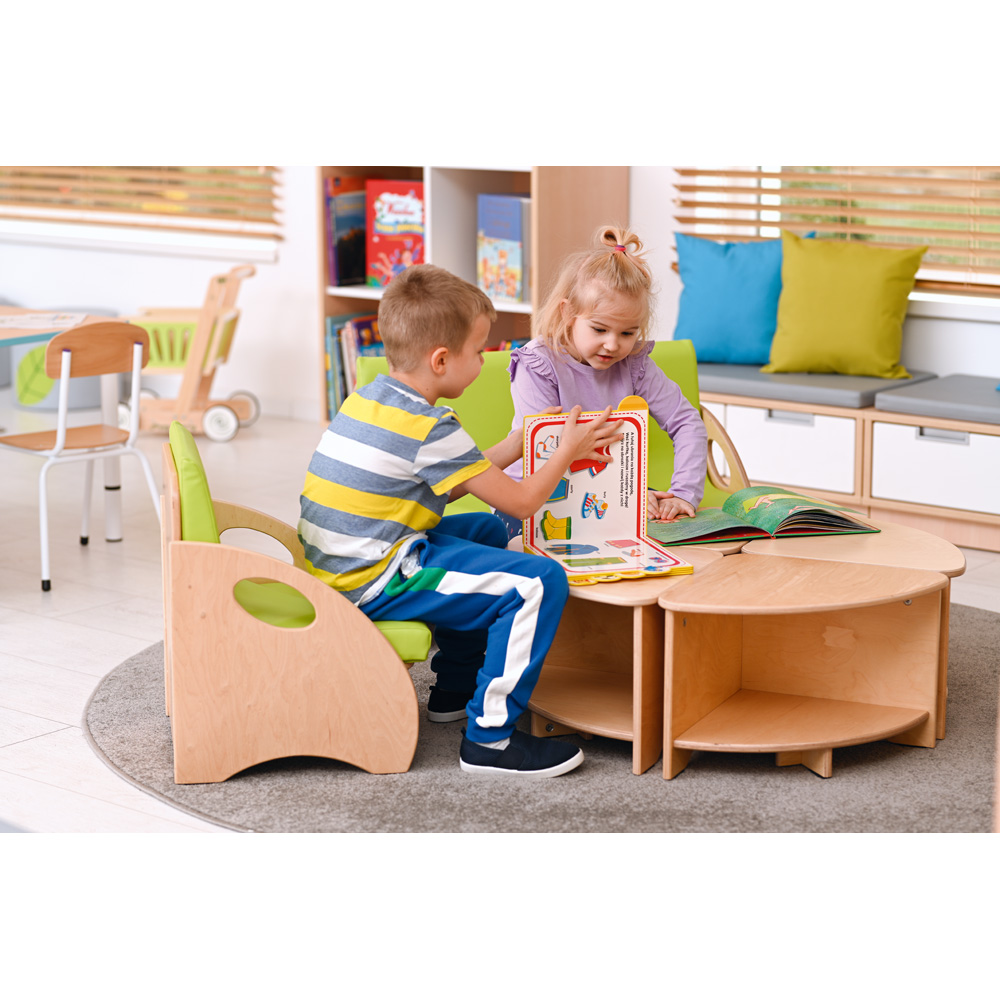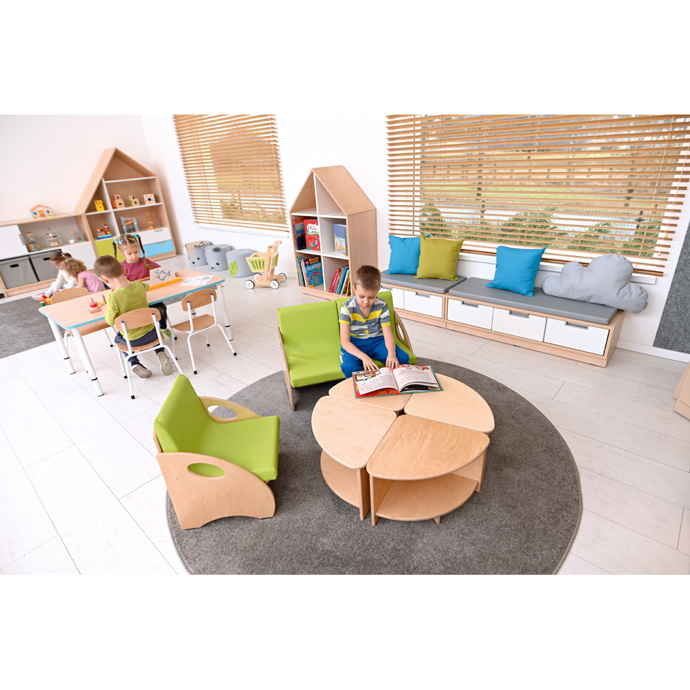 Eine Sitzgruppe bestehend aus Tisch, Sessel und Bank. Beliebig erweiterbar. Farbige Sitzauflagen sind separat bestellbar (855448-855451). Die neutrale, warme Farbegebung des Holzes und die sichtbare Holzstruktur passen perfekt in jedes Raumarrangement und verleihen ihm nicht nur Funktionalität, sondern auch Charme. Alle Kanten und Ecken sind abgerundet.