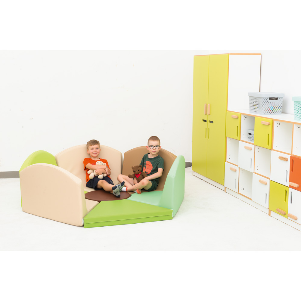 Ein Kreis aus Schaumstoffmatten mit Rückenlehne in gedeckten Farben, die sich als Sitzgelegenheiten, z. B. in einer Ruheecke, als nützlich erweisen. Der Bezug ist aus leicht zu reinigendem PVC-Gewebe.