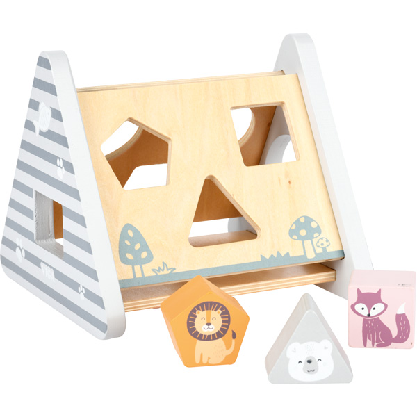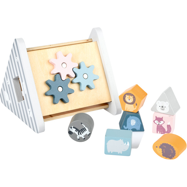 Einzelne Elemente passen in die unterschiedlich geformten Öffnungen des Holzspielzeugs; verhilft den Kleinen das räumliche Vorstellungsvermögen, die Kreativität sowie die Ausdauer zu entwickeln. An einer Wand gibt es zusätzlich drehbare Zahnräder. • aus Holz, in freundlichen Pastellfarben • 7 Steckelemente, Masse: 4 x 4 x 3 cm • Masse: 16 x 16 x 14 cm • ab 24 Monaten