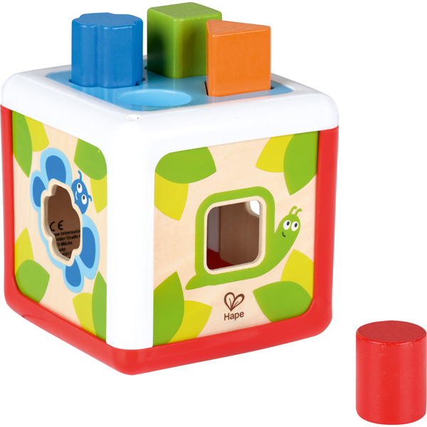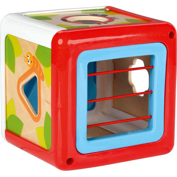 Bunter Sortierwürfel mit 4 Öffnungen in diversen Formen. Jedes richtig zugeordnete Teil, das durch die Seitenwände nach innen fällt, beschert ein Erfolgserlebnis. Fördert das räumliche Vorstellungsvermögen und die Feinmotorik des Kindes.