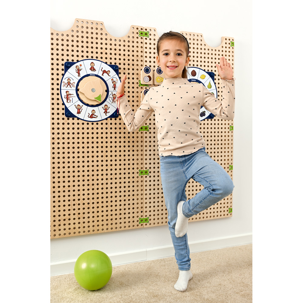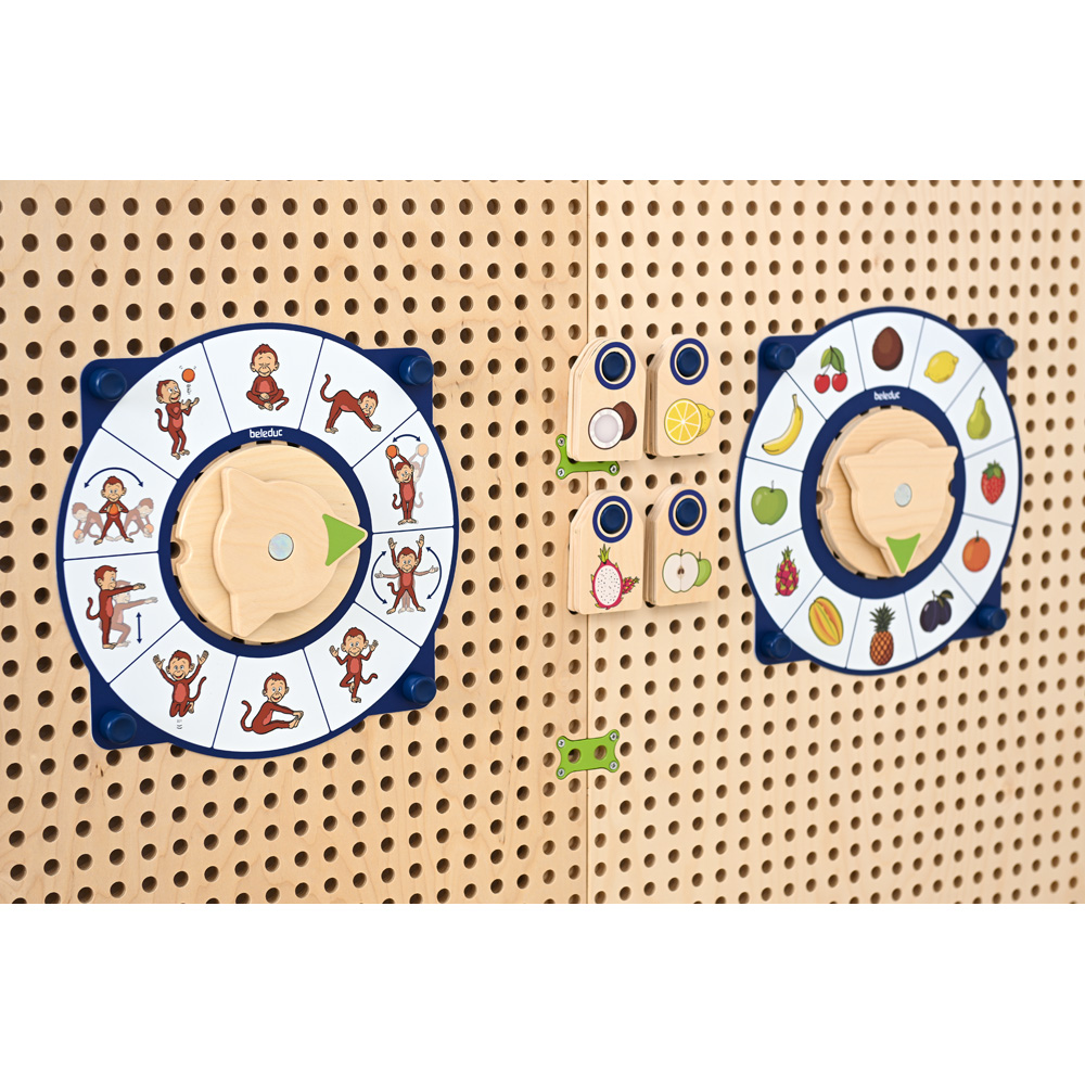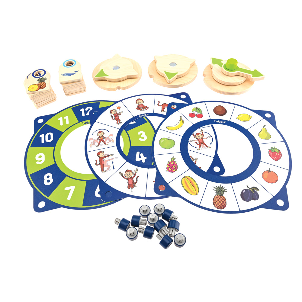 Das Set bietet 5 Spielmöglichkeiten: 2 Memospiele – mit Früchten und Tieren, 1 Bewegungsspiel mit Gymnastik und Yoga für die ganze Gruppe, 1 Kommunikationsspiel über Emotionen und 1 Uhr mit Holzzeiger, die dabei hilft, den Tag zu strukturieren. Es können zwei Spiele gleichzeitig gespielt werden, da das Set zwei drehbare Holzräder enthält.