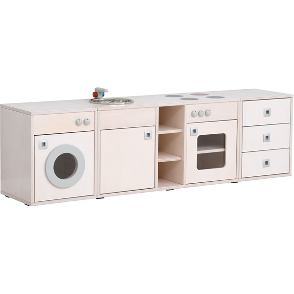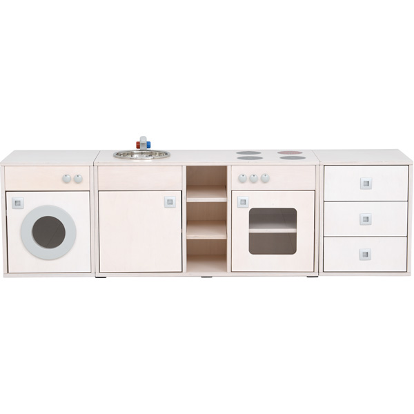 Die Spielecke Bianca bildet eine Spielkulisse für Rollenspiele und umfasst 13 Module (Küchenausstattung und Kleiderschränke). Mit den Modulen lässt sich eine Spielecke nach individuellem Bedürfnis ausstatten. Hier können die Kinder das Familienleben nachstellen und sich in diversen Rollen ausprobieren. Die Möbel sind aus weiss gebeiztem und lackiertem Sperrholz (Stärke: 19 mm) gefertigt – hochwertig und stabil. Frei im Raum aufstellbar dank hochwertig gearbeiteter Rückwände. Kunststoffgleiter unter dem Boden schonen den Fussboden.