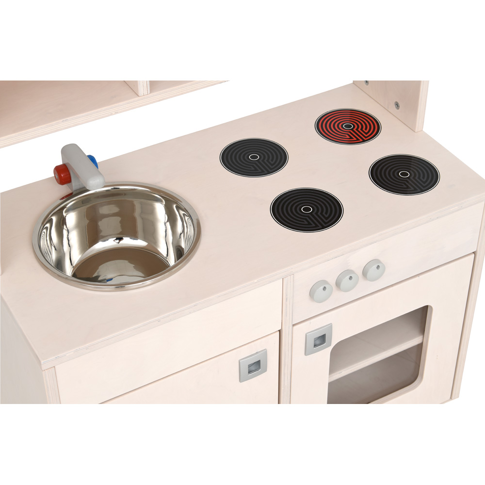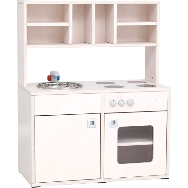 Die Spielecke Bianca bildet eine Spielkulisse für Rollenspiele und umfasst 13 Module (Küchenausstattung und Kleiderschränke). Mit den Modulen lässt sich eine Spielecke nach individuellem Bedürfnis ausstatten. Hier können die Kinder das Familienleben nachstellen und sich in diversen Rollen ausprobieren. Die Möbel sind aus weiss gebeiztem und lackiertem Sperrholz (Stärke: 19 mm) gefertigt – hochwertig und stabil. Frei im Raum aufstellbar dank hochwertig gearbeiteter Rückwände. Kunststoffgleiter unter dem Boden schonen den Fussboden.