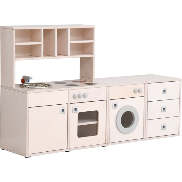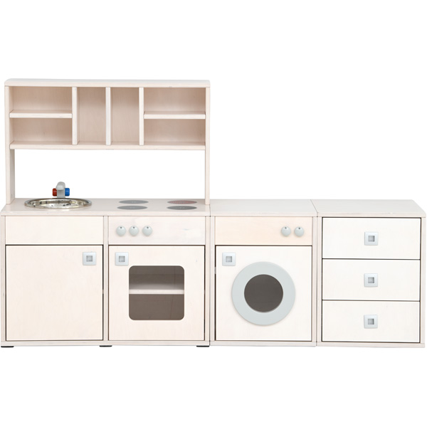 Die Spielecke Bianca bildet eine Spielkulisse für Rollenspiele und umfasst 13 Module (Küchenausstattung und Kleiderschränke). Mit den Modulen lässt sich eine Spielecke nach individuellem Bedürfnis ausstatten. Hier können die Kinder das Familienleben nachstellen und sich in diversen Rollen ausprobieren. Die Möbel sind aus weiss gebeiztem und lackiertem Sperrholz (Stärke: 19 mm) gefertigt – hochwertig und stabil. Frei im Raum aufstellbar dank hochwertig gearbeiteter Rückwände. Kunststoffgleiter unter dem Boden schonen den Fussboden.