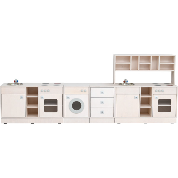 Die Spielecke Bianca bildet eine Spielkulisse für Rollenspiele und umfasst 13 Module (Küchenausstattung und Kleiderschränke). Mit den Modulen lässt sich eine Spielecke nach individuellem Bedürfnis ausstatten. Hier können die Kinder das Familienleben nachstellen und sich in diversen Rollen ausprobieren. Die Möbel sind aus weiss gebeiztem und lackiertem Sperrholz (Stärke: 19 mm) gefertigt – hochwertig und stabil. Frei im Raum aufstellbar dank hochwertig gearbeiteter Rückwände. Kunststoffgleiter unter dem Boden schonen den Fussboden.