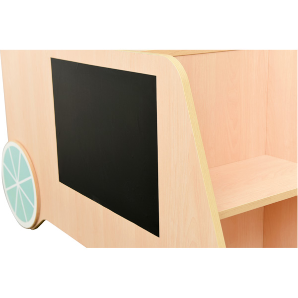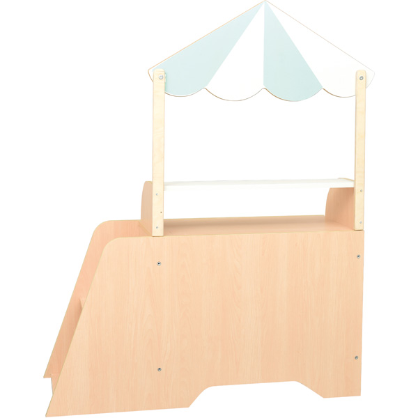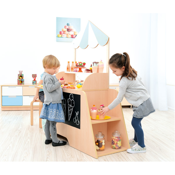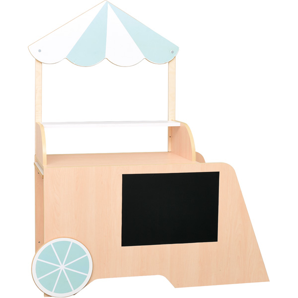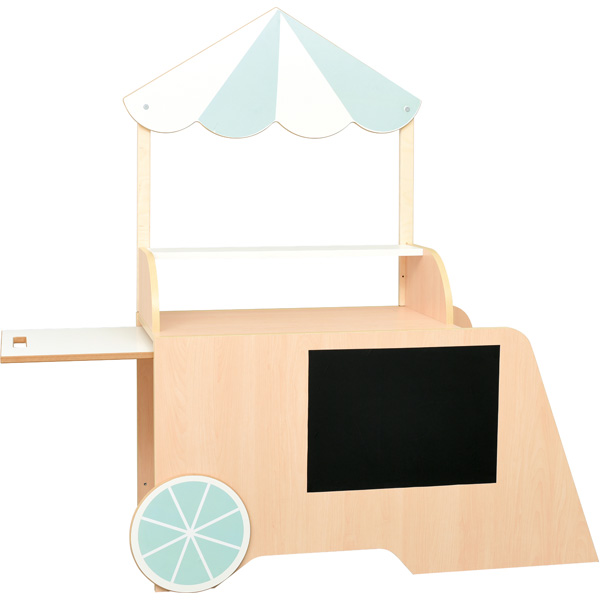 Wer möchte ein Eis? Am Eiswagen bekommt jeder eine Kugel. Vorne an der Tafel kann man gleich das Tagesangebot ablesen. Der seitlich ausziehbare Tisch lädt zum Verweilen ein; auf der gegenüberliegenden Seite bieten 2 Regalböden Ablagefläche.