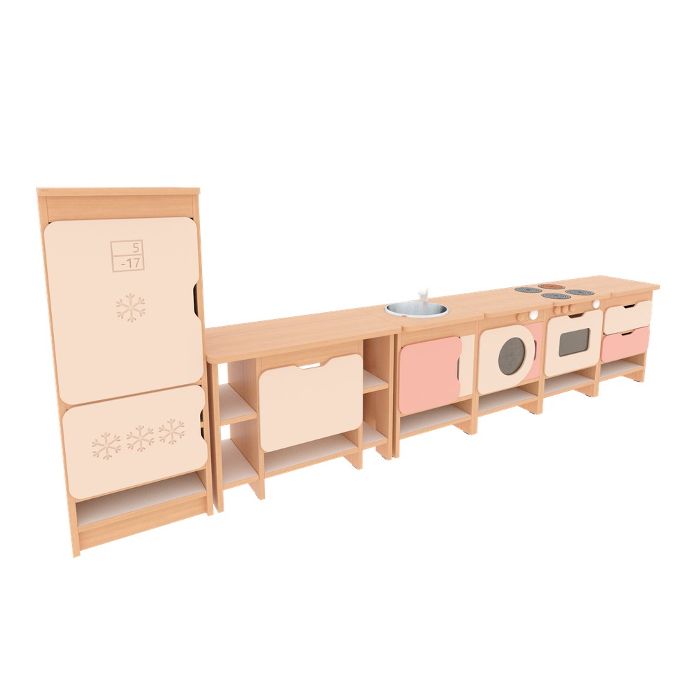 Die farbenfrohe Küche bildet eine Spielkulisse für Rollenspiele und umfasst diverse Module (Herd, Spüle, Schubladenschrank, Waschmaschine, Kühlschrank, Regalschrank, Eckschrank und Eckregal). Die Möbel sind aus laminierter Spanplatte (12 mm) in Ahorn-Optik oder weiss, Fronten aus farbig folierter MDF‑Platte gefertigt. Die Zusammensetzung und die Farben der Fronten in jeweiligem Set sind stets wie abgebildet.