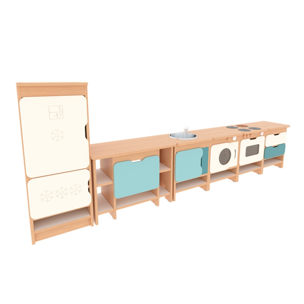 Die farbenfrohe Küche bildet eine Spielkulisse für Rollenspiele und umfasst 8 Module (Herd, Spüle, Schubladenschrank, Waschmaschine, Kühlschrank, Regalschrank, Eckschrank und Eckregal). Die Möbel sind aus laminierter Spanplatte (12 mm) in Ahorn-Optik oder weiss, Fronten aus farbiger MDF‑Platte gefertigt.