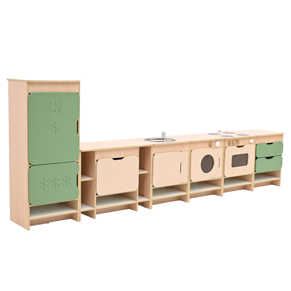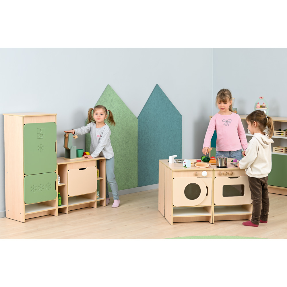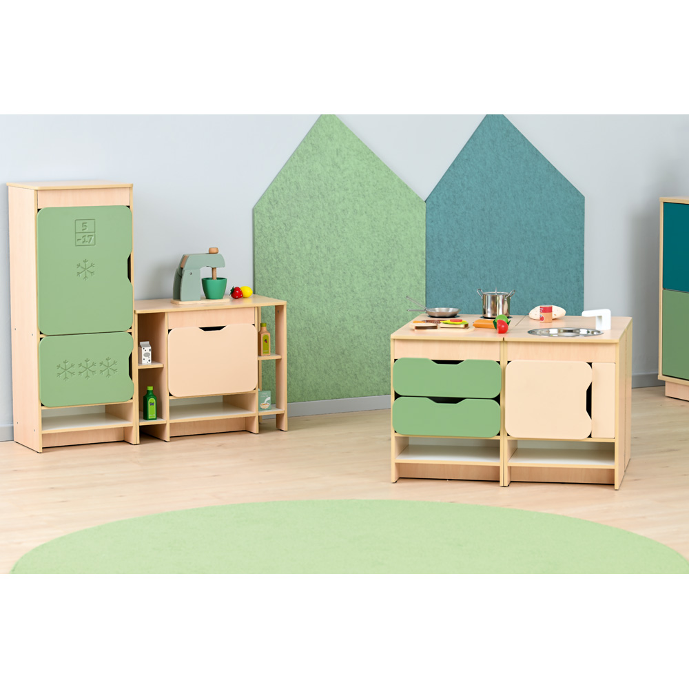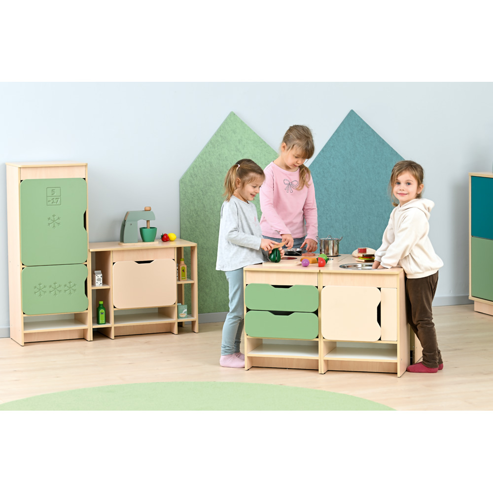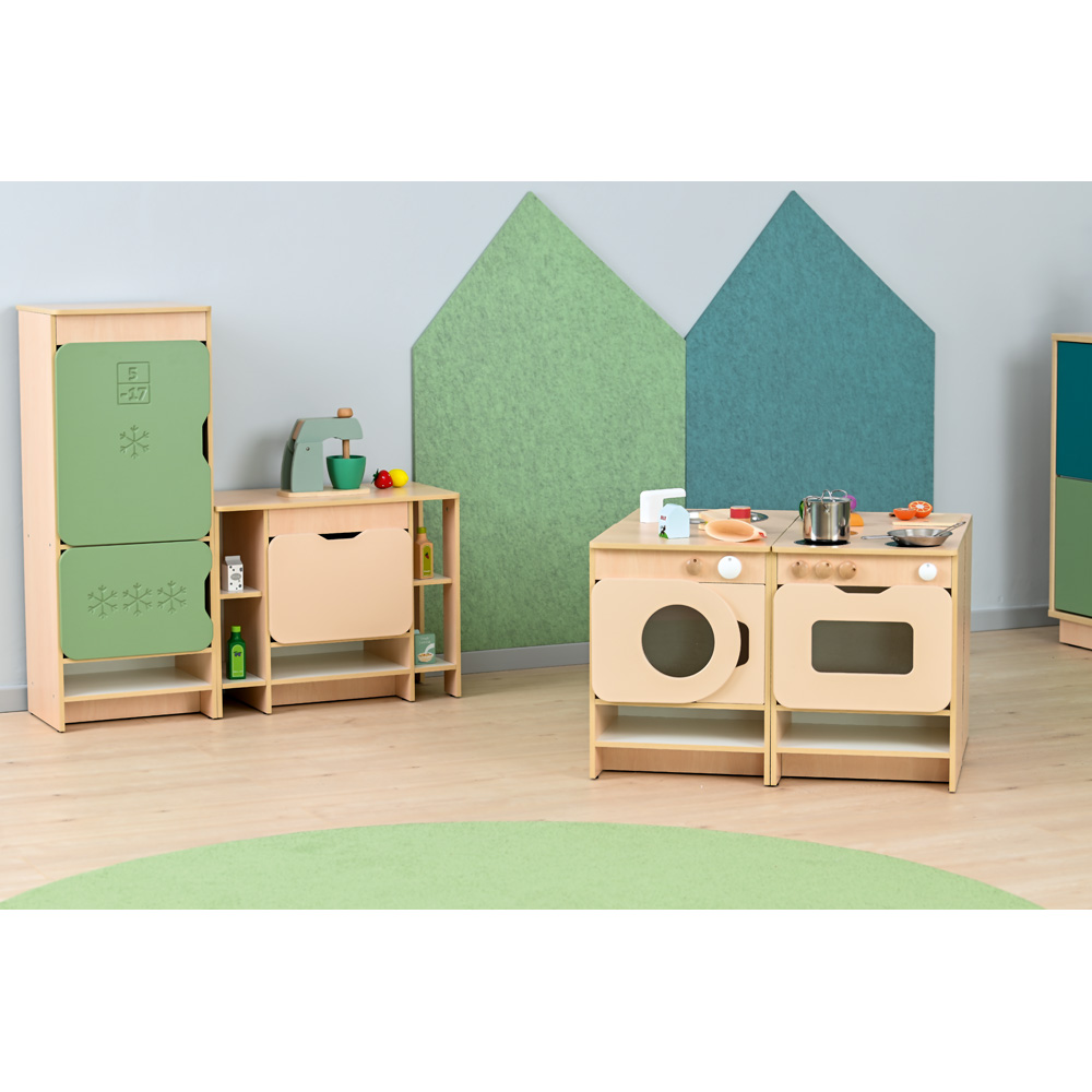 Die farbenfrohe Küche bildet eine Spielkulisse für Rollenspiele und umfasst diverse Module (Herd, Spüle, Schubladenschrank, Waschmaschine, Kühlschrank, Regalschrank, Eckschrank und Eckregal). Die Möbel sind aus laminierter Spanplatte (12 mm) in Ahorn-Optik oder weiss, Fronten aus farbig folierter MDF‑Platte gefertigt. Die Zusammensetzung und die Farben der Fronten in jeweiligem Set sind stets wie abgebildet.