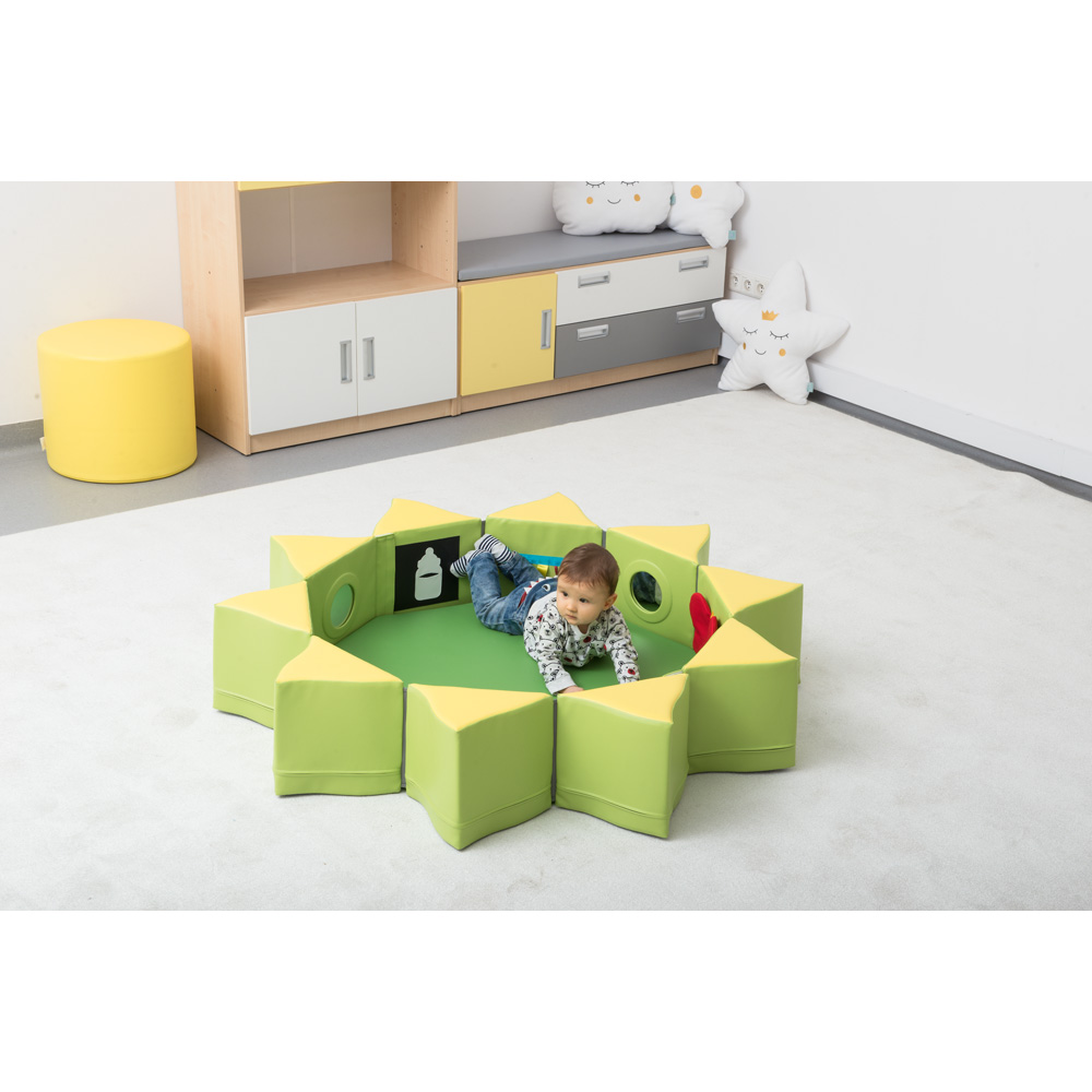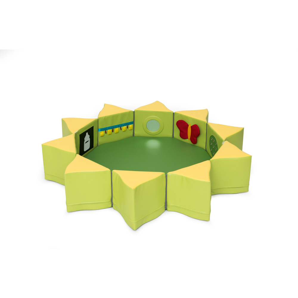 Ein Set aus Schaumstoffelementen mit Applikationen und Spiegeln, die zusammengestellt eine Spielinsel bilden. Die farbenfrohen Elemente wecken das Interesse der Kleinen, regen sie zum Spielen und Erkunden ihrer Umgebung an und nehmen im zusammengeklappten Zustand nur wenig Platz ein.