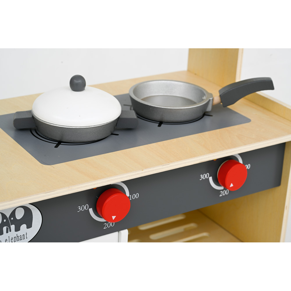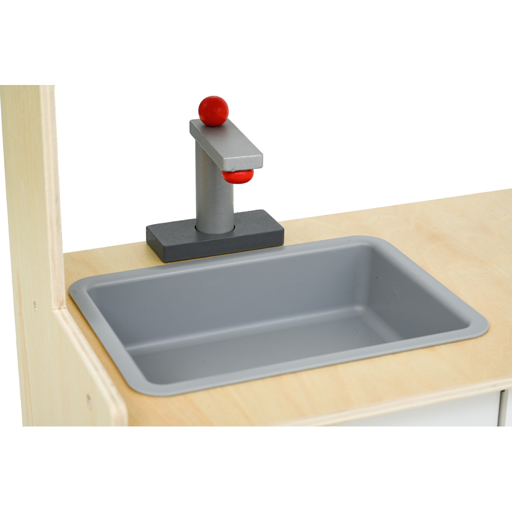 In der modernen Holzspielküche können sich die Kleinen stundenlang beschäftigen. Sie bietet Platz für kreative Rollenspiele. Die Küche ist mit einer Spüle, einer Mikrowelle, einem Herd und diversen Küchenutensilien ausgestattet. Auch eine Uhr ist vorhanden, damit man beim Backen die Zeit einstellen kann.