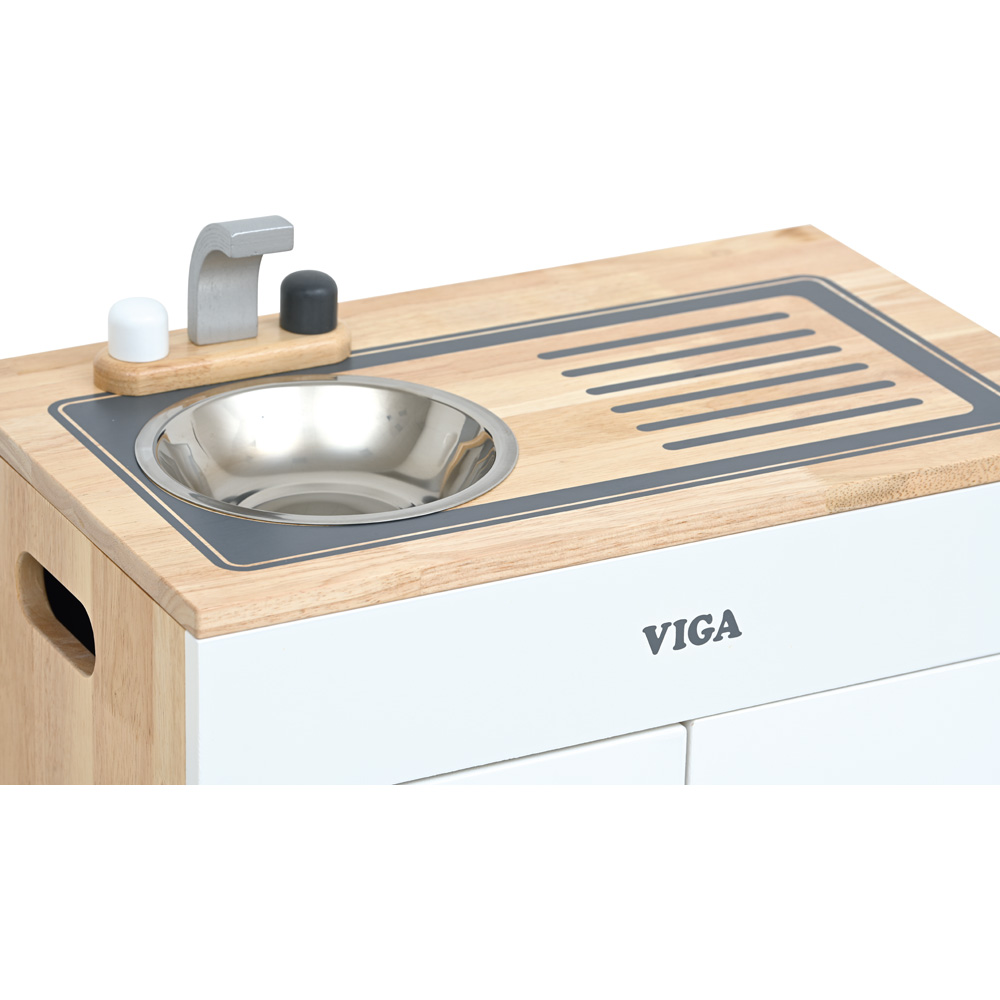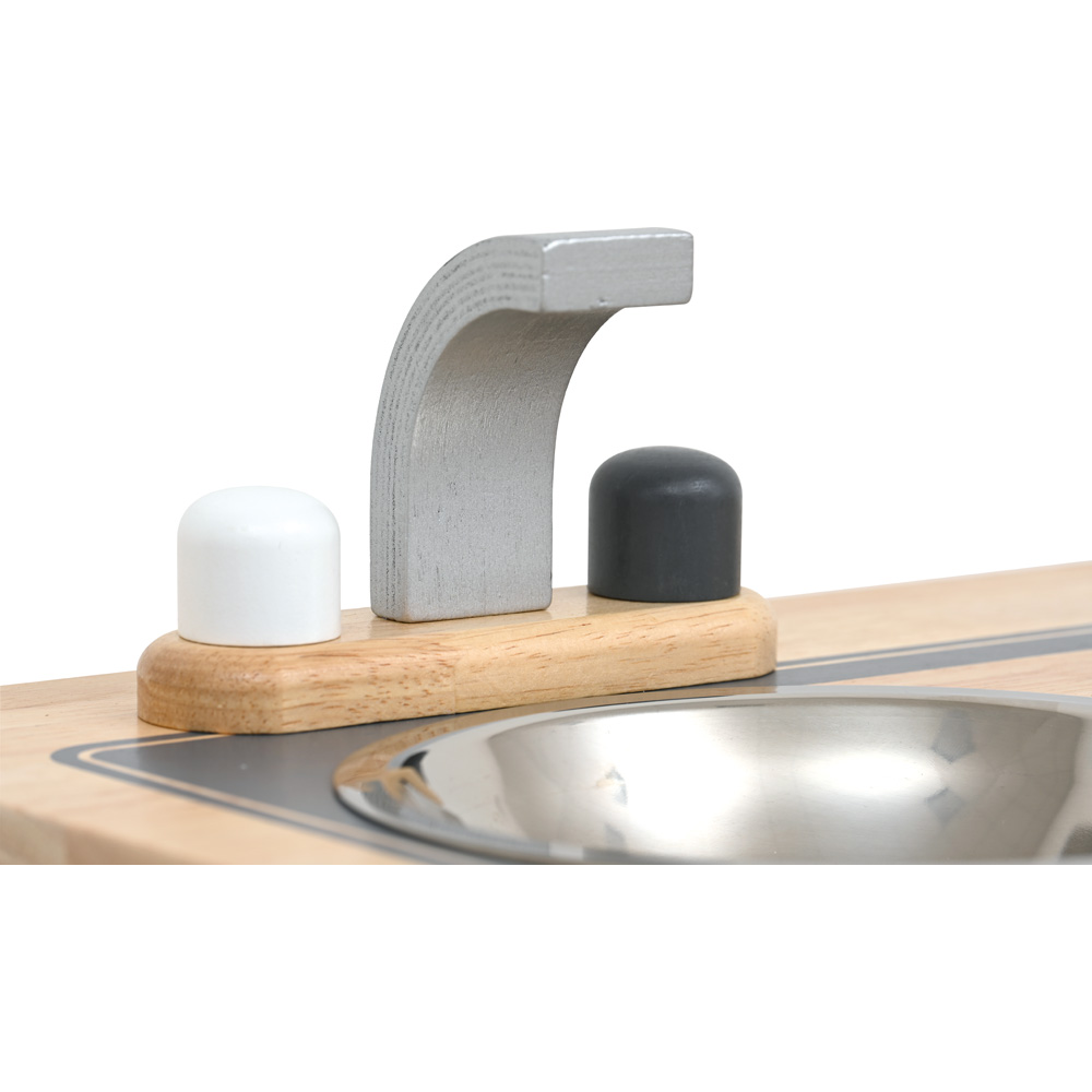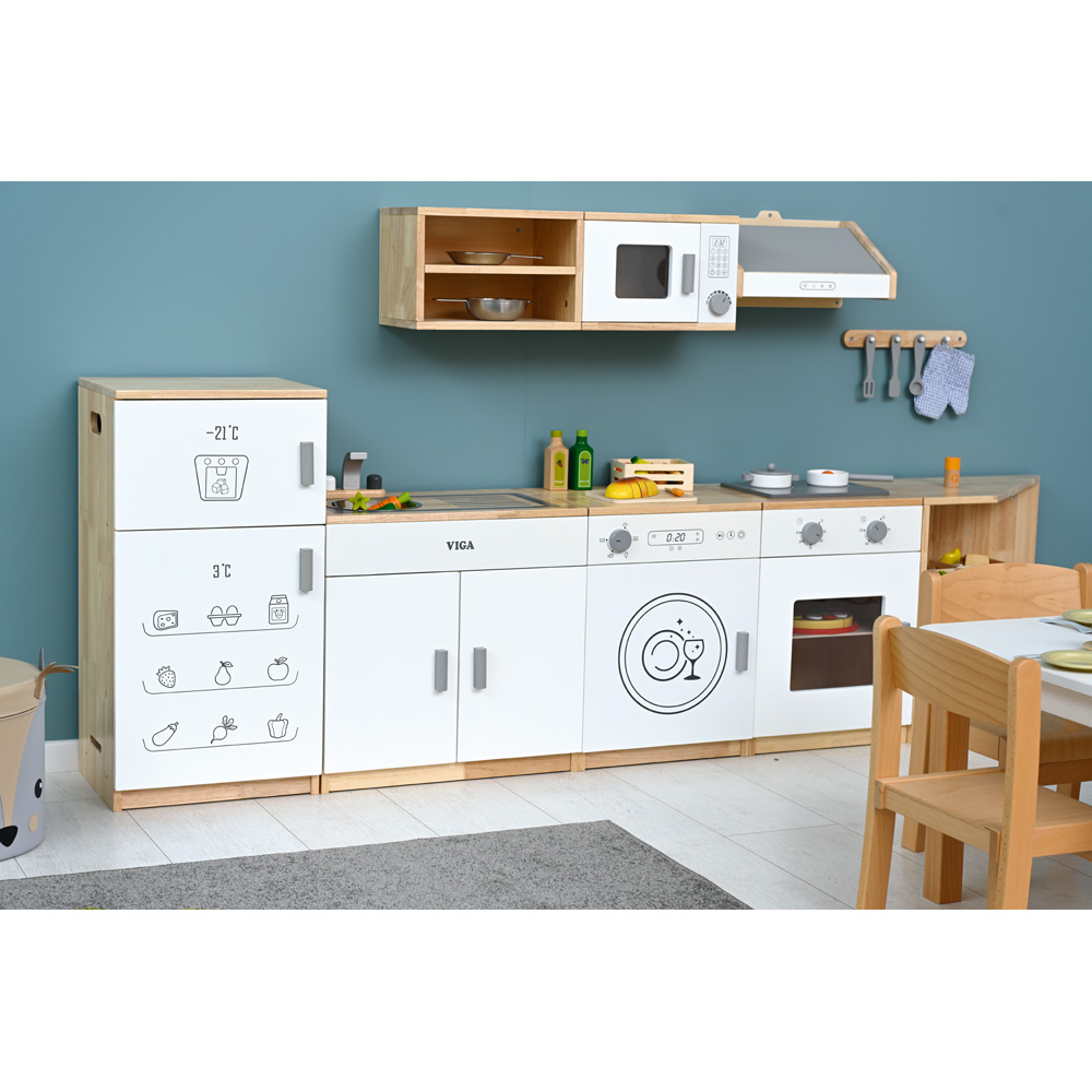 Kinder lieben es, in der Küche zu spielen! Hierbei werden Alltagssituationen realitätsgetreu nachempfunden und dabei Regeln des Zusammenlebens verinnerlicht. Kulturelle Bräuche und der soziale Umgang miteinander werden im Rollenspiel ohne Druck und Zwang erlernt. Das Rollenspiel fördert Kommunikation, Gemeinschaftsgefühl und soziale Fähigkeiten. Die Schränke haben seitliche Aussparungen, die beim Umräumen nützlich sind.