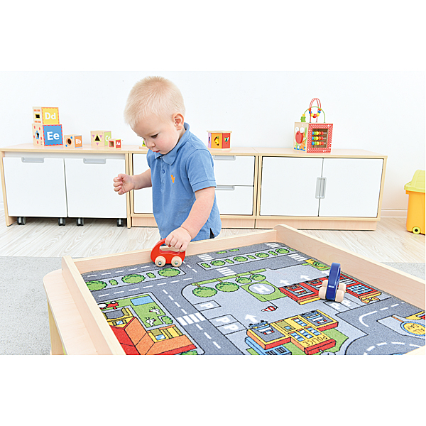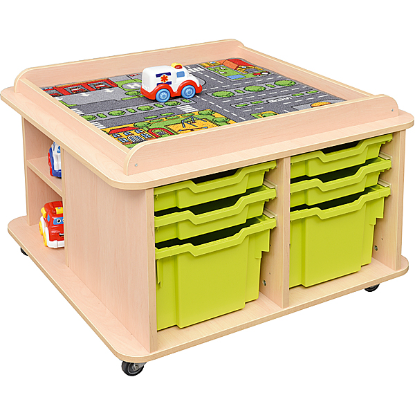 Dieser Tisch bietet sowohl Platz zum Spielen, als auch Stauraum. Die Spielmatten eignen sich für die Deckplatte; diese bildet auch die ideale Unterlage zum Spiel mit der Holzeisenbahn (z.B. 575001–575055) oder mit Holzbausteinen (u.a. 542015–542019). Im Unterbau befinden sich an zwei gegenüberliegenden Seiten Regalteile. Grosse offene Fächer können individuell mit unseren Kunststoffbehältern (Art. Nr. 372xxx – in 13 Farben – separat zu bestellen) ausgestattet werden; passende Führungsschienen werden mit den Behältern geliefert.