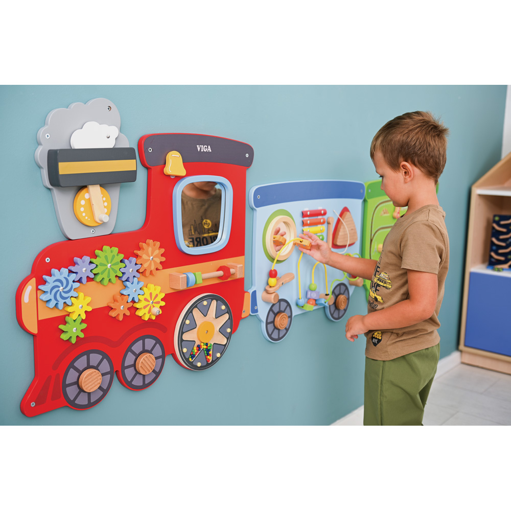 Die bunten Zahnräder, Schiebeelemente, Kugellabyrinth und die Klangelemente schulen die Auge-Hand-Koordination und die motorischen Fähigkeiten. Für einfache Handhabung und Montage besteht die Spielwand aus 4 Teilen.