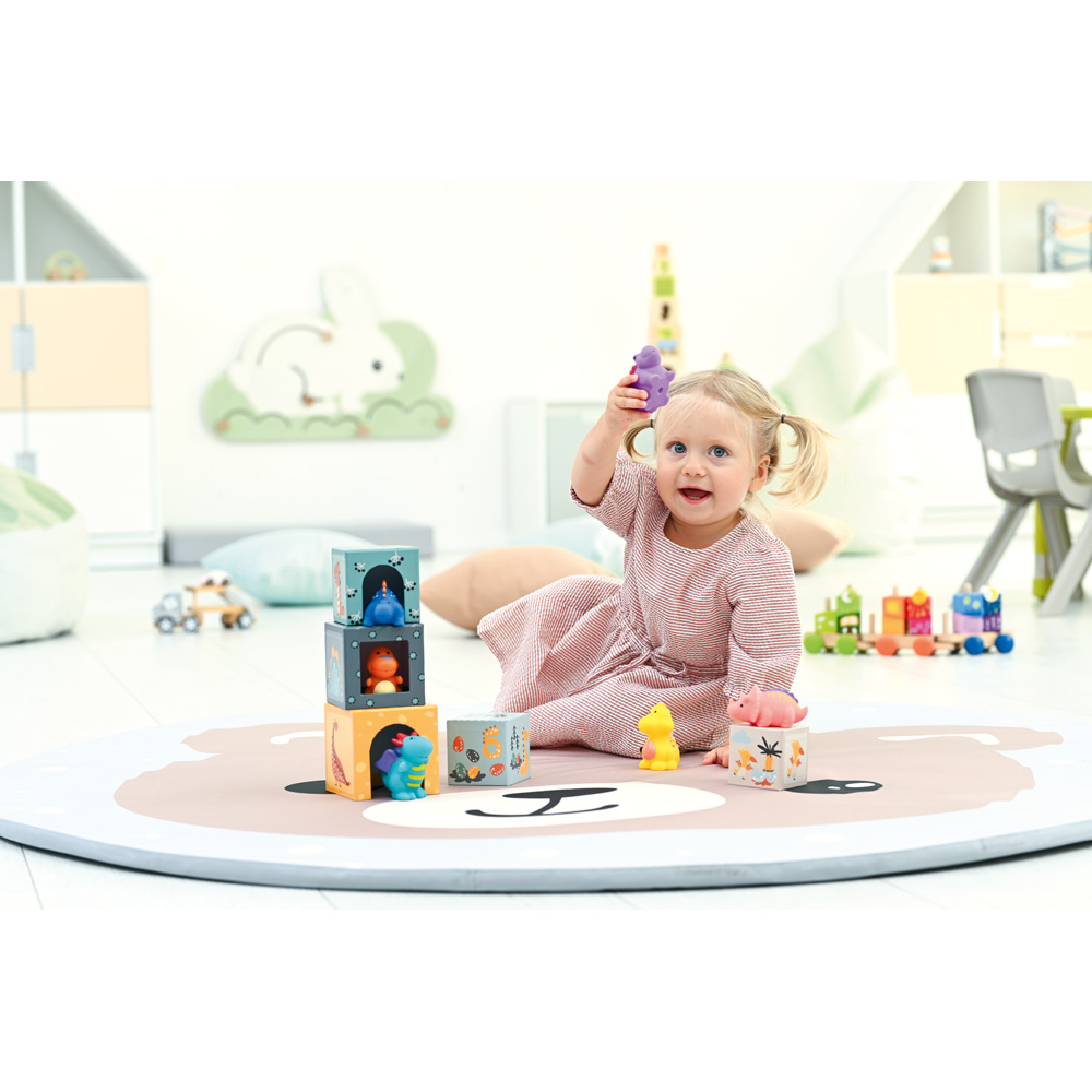 Ein Set mit bunten Boxen und Tieren in sanften und gedeckten Farben. Aus den Schachteln können Kinder einen Turm bauen, wobei jede Etage Platz für eine Tierfigur bietet. Das Spielen fördert die Feinmotorik, die Auge-Hand-Koordination, die taktile Wahrnehmung und lehrt die Kinder, Farben und Grössen zu erkennen.
