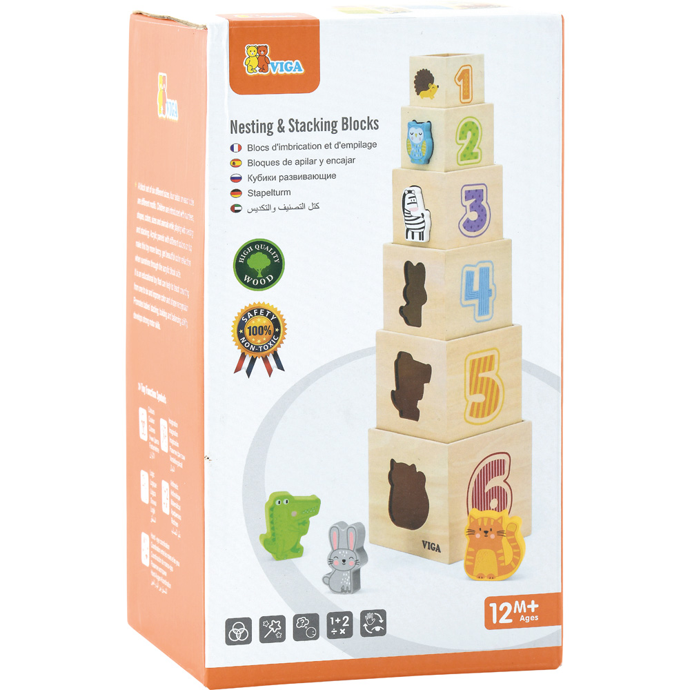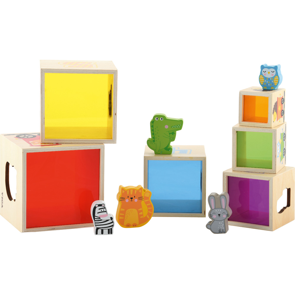 6 Würfel mit Zahlen und Öffnungen, in denen verschiedene Tiere wohnen. Die Seitenöffnung in einem Würfel ist an die Konturen des Bewohners angepasst, so dass das Kind die richtige Form finden muss. Abgebildet sind auch Mengen mit steigender Anzahl, so dass erste Schritte in die Zahlenwelt möglich sind.