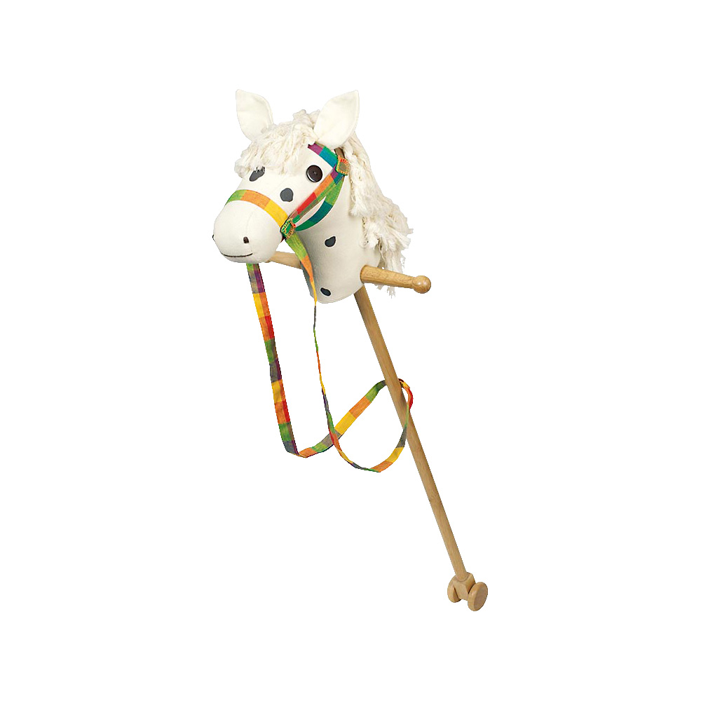 Ich bin bereit für den Ausritt! Ein Pferd auf einem Holzstab mit Rollen am Ende, mit weichem, weissem Kopf und schwarzen Punkten aus Baumwollstoff. Für drinnen und draussen.