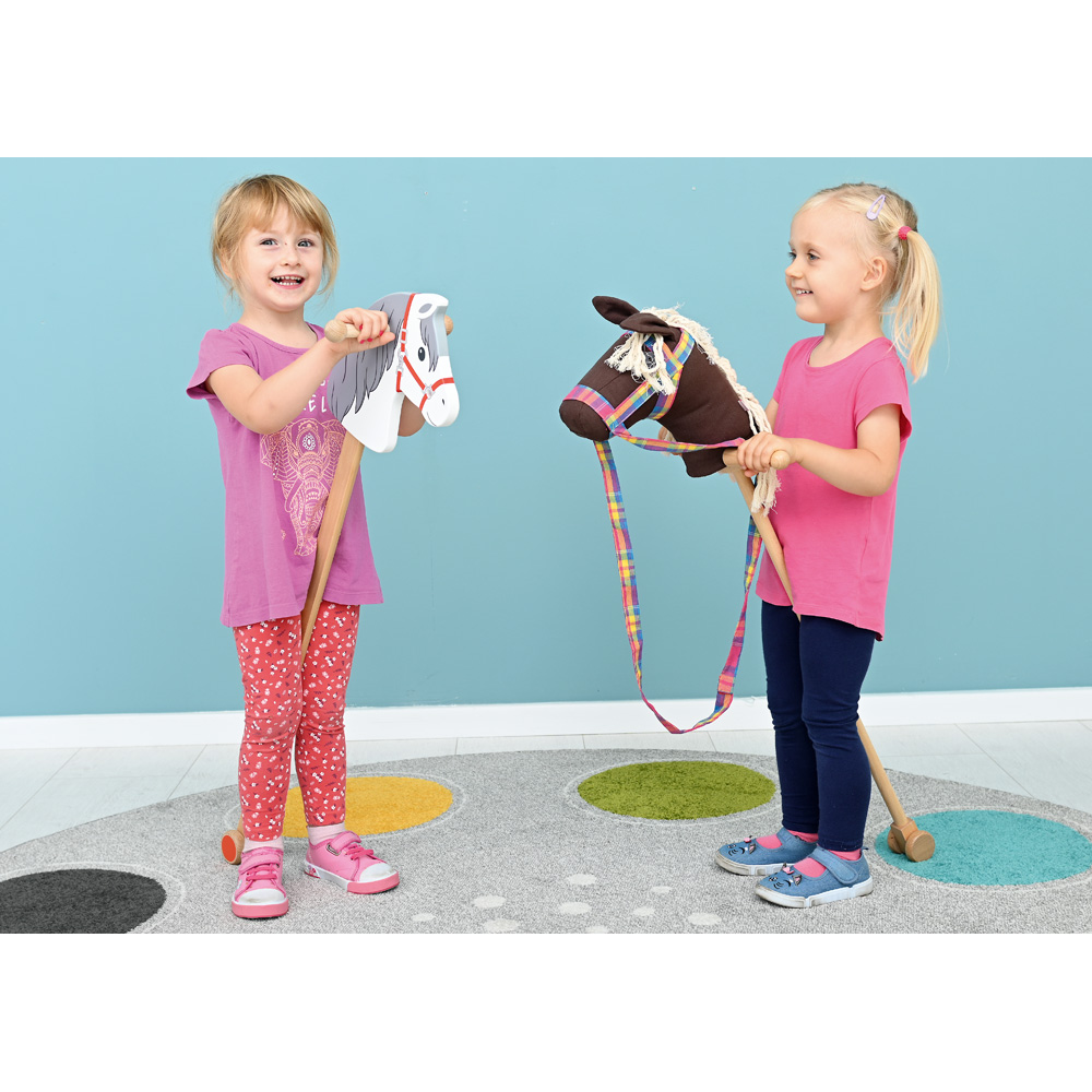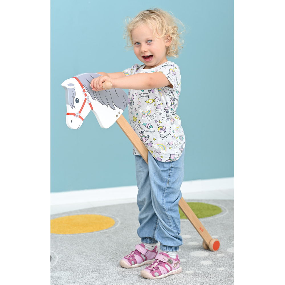Dieses wunderschöne Holzpferdchen sucht ein pferdebegeistertes Kind, welches mit ihm über Stock und Stein springt. Es eignet sich sowohl für drinnen als auch draussen zum Spielen. Die Räder am Ende des Stocks erleichtern dem kleinen Reiter das Spielen. Der Kopf des Pferdes bietet Platz für die Montage von Griffen.