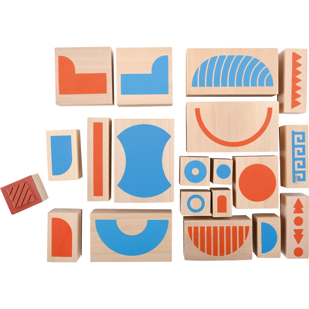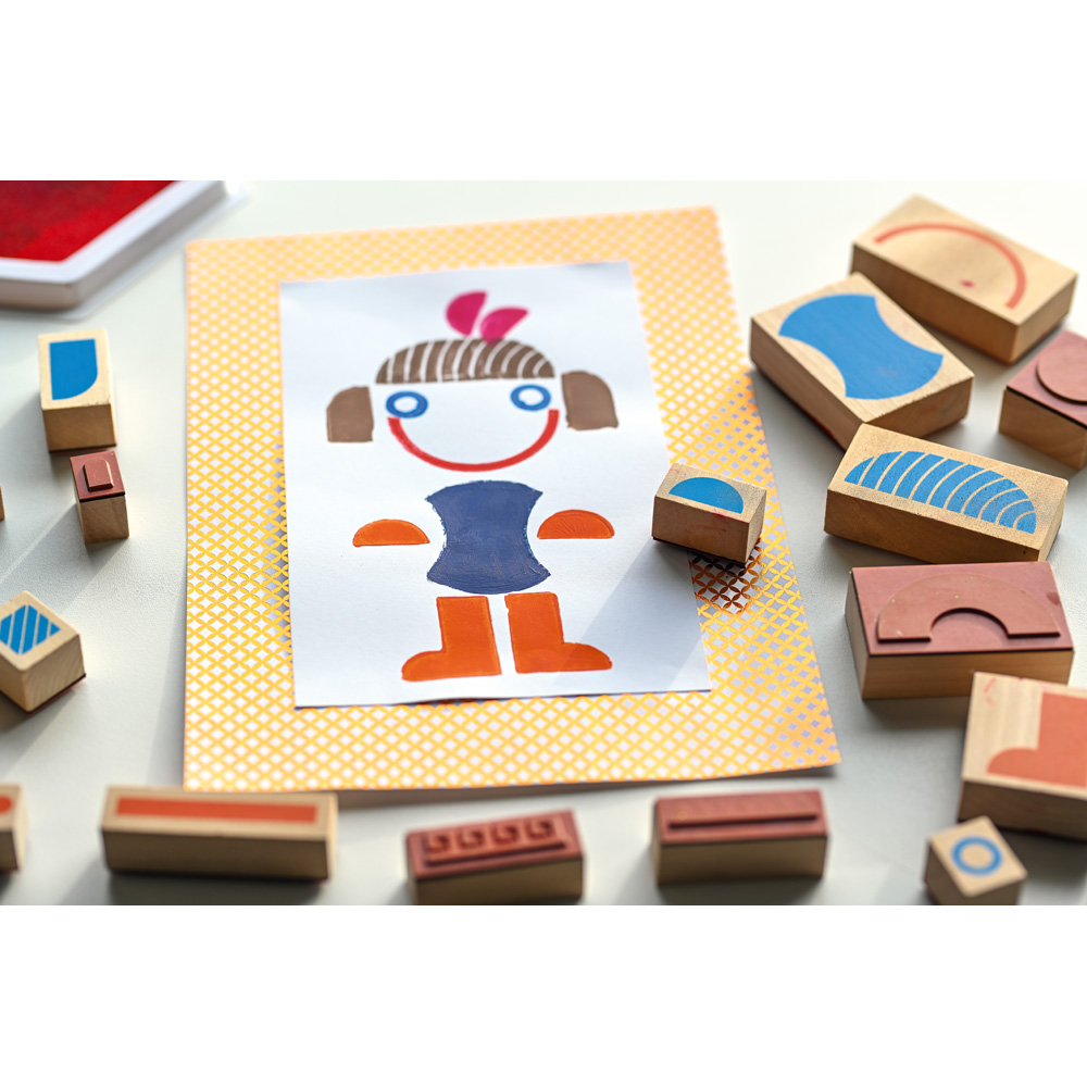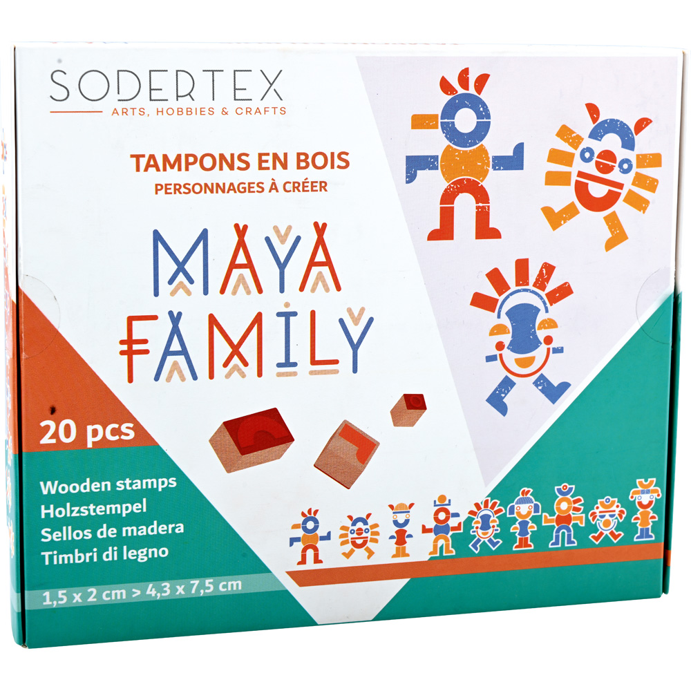 Mit diesen Holzstempeln in verschiedenen Formen und Grössen können Kinder Charaktere im Maya-Stil schaffen. Auf der Verpackung finden sich Abbildungen zum Nachstempeln - oder man lässt seiner Fantasie freien Lauf.