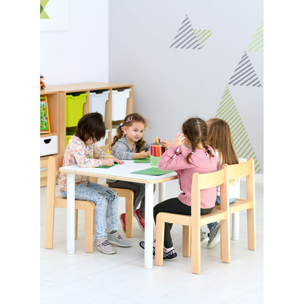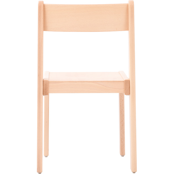 Das Gestell der stabilen Kinderstühle ist aus lackiertem Buche-Massivholz (Querschnitt 20 x 50 mm). Die profilierte Sitzfläche (Sperrholz, 6 mm stark) mindert beim Sitzen den Druck auf die Kniekehle, und die bequeme Rückenlehne aus verstärktem Sperrholz (Stärke 15 mm) unterstützt die richtige Körperhaltung. Filzkratzschutz an den Stuhlbeinen verhindert Schäden am Fussboden. Dank ihrer Konstruktion sind diese Stühle platzsparend und sicher stapelbar (bis 5 Stck.). Sie sind in den Grössen 1-4 erhältlich. Die Produktion erfolgt gemäss DIN EN 1729.