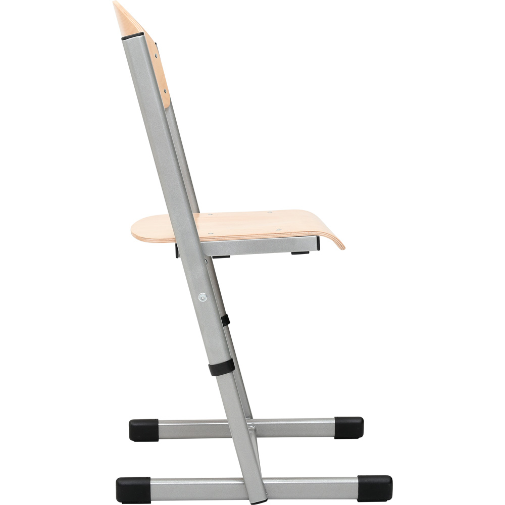 Gestell des T-Stuhls ist aus ovalem Metallrohr (38x20 mm) hergestellt, Sitzfläche und Rückenlehne aus lackiertem Buche-Sperrholz. Profilierte Sitzfläche mindert beim Sitzen den Druck auf die Kniekehle; bequeme, leicht gerundete Rückenlehne bietet hohen Komfort. Stuhlbeine bilden im unteren Teil ein H, dies sichert die Stabilität. Die Stühle können platzsparend gestapelt oder an die Tischplatten gehängt werden - drei Plastikgleiter unter der Sitzfläche verhindern Kratzspuren auf den Tischplatten. Zum Schutz des Fussbodens haben die Stuhlbeine Fusskappen. Produktion erfolgt gemäss DIN EN 1729-1: 2007 sowie DIN EN 1729-2: 2007.