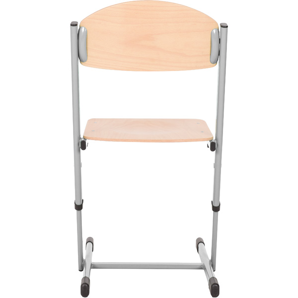 Schülerstuhl mit T-Fuss. Gestell der TS-Stühle besteht aus ovalem Metallrohr (38 x 20 mm und 30 x 15 mm), Sitzfläche und Rückenlehne aus lackiertem Buche-Sperrholz (Stärke: 8 mm). Profilierte Sitzfläche mindert beim Sitzen den Druck auf die Kniekehle; bequeme, leicht gerundete Rückenlehne bietet hohen Komfort. Gestell umschliesst die gesamte Sitzfläche, die Sitzvorderkante ist gestellintegriert, schützt effektiv vor Beschädigung durch Stösse. Stuhlbeine bilden im unteren Teil ein H, dies sorgt für Standsicherheit und Stabilität. Die Stühle können platzsparend gestapelt (bis 3 Stck.) oder an die Tischplatten gehängt werden - drei Plastikgleiter unter der Sitzfläche verhindern Kratzspuren auf den Tischplatten. Zum Schutz des Fussbodens haben die Stuhlbeine Fusskappen. Die Produktion erfolgt gemäss DIN EN 1729.