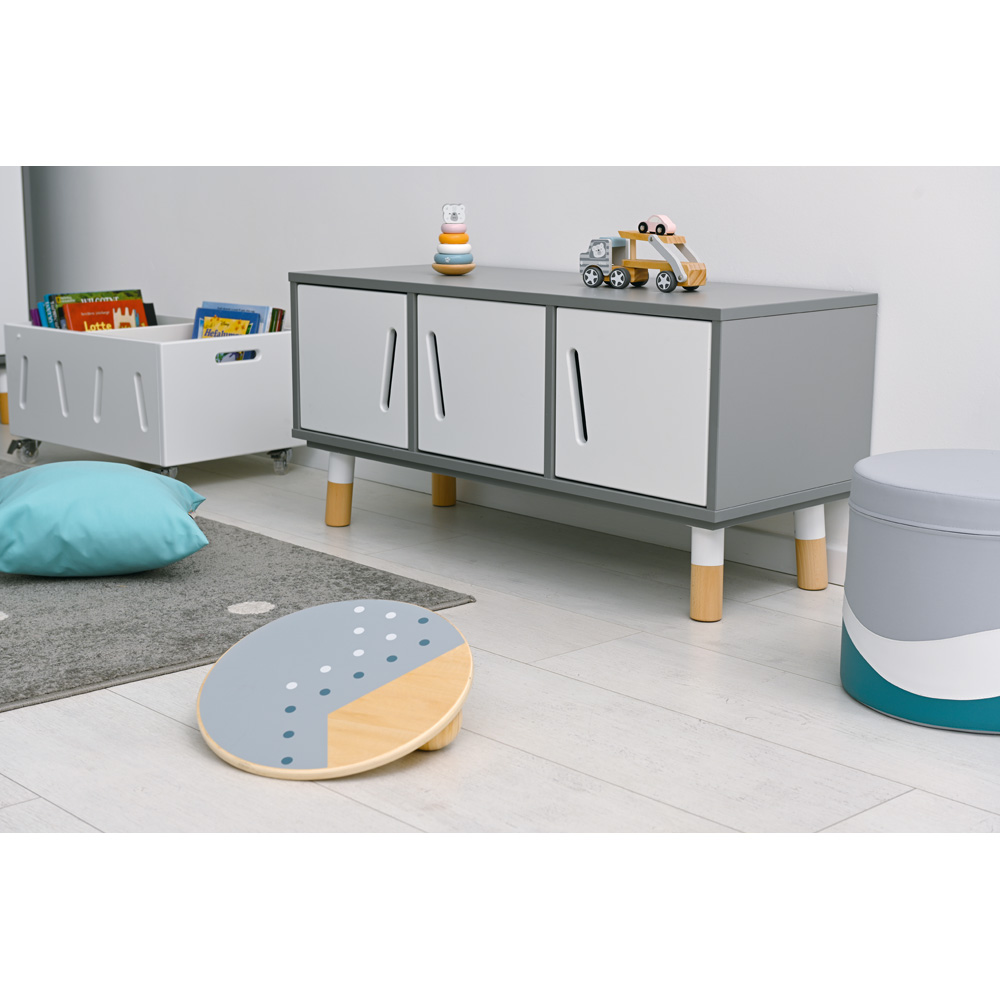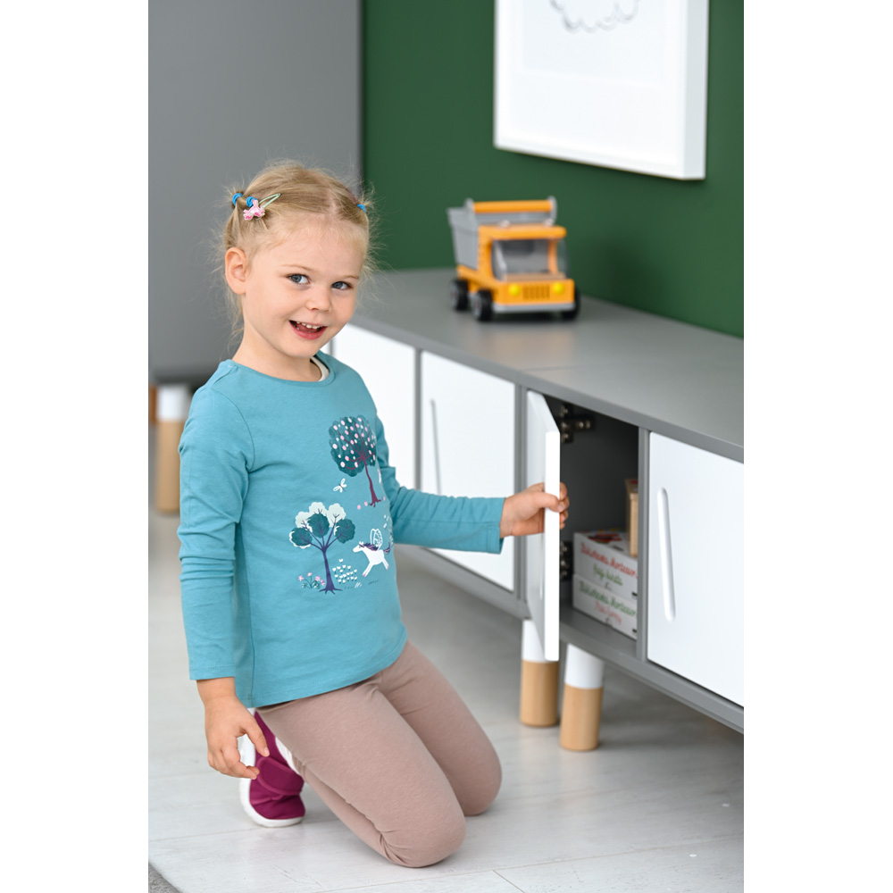 Die Kindermöbel der TAB-Kollektion bringen Veränderungen in die Räumlichkeiten. Hohe Erwartungen der Eltern mit immer mehr ästhetischen Ansprüchen, das Bewusstsein einer Gefahr der Überreizung für Kinderaugen und viele andere Faktoren führen dazu, dass Kindergartenmöbel immer unauffälliger, funktioneller und bequemer werden. Aber trotzdem hohen Komfort bieten. Die Schränke sind aus grau laminierter Dreischichtplatte mit Fronten aus weiss lackierter MDF-Platte.