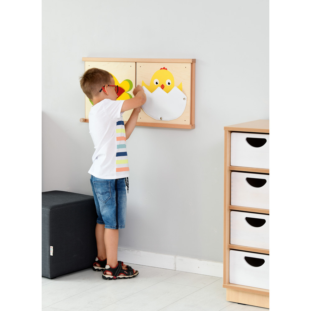 Dekorative Elemente aus Sperrholz mit einer Vielzahl von Motiven, die Kinder zum Spielen, Beobachten und Berühren anregen; Oberflächen können erforscht und Verschlüsse betätigt werden; Montagematerial inklusive; an der Wand zu befestigen (einzeln oder paarweise in einem Rahmen); Rahmen zur Wandmontage (118252) separat bestellbar