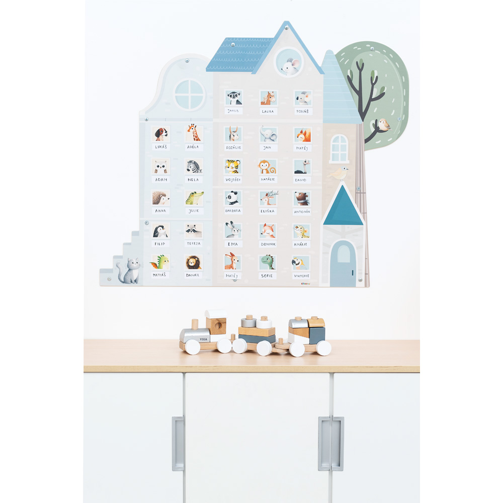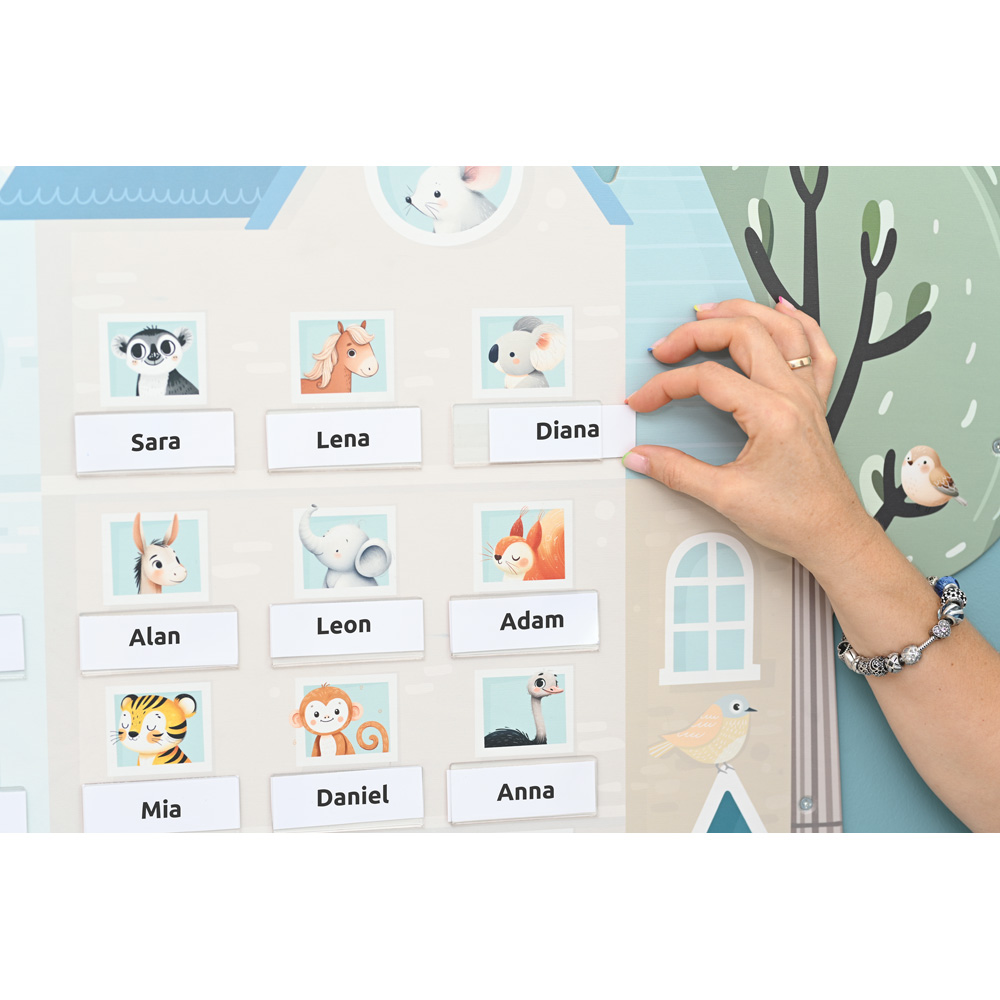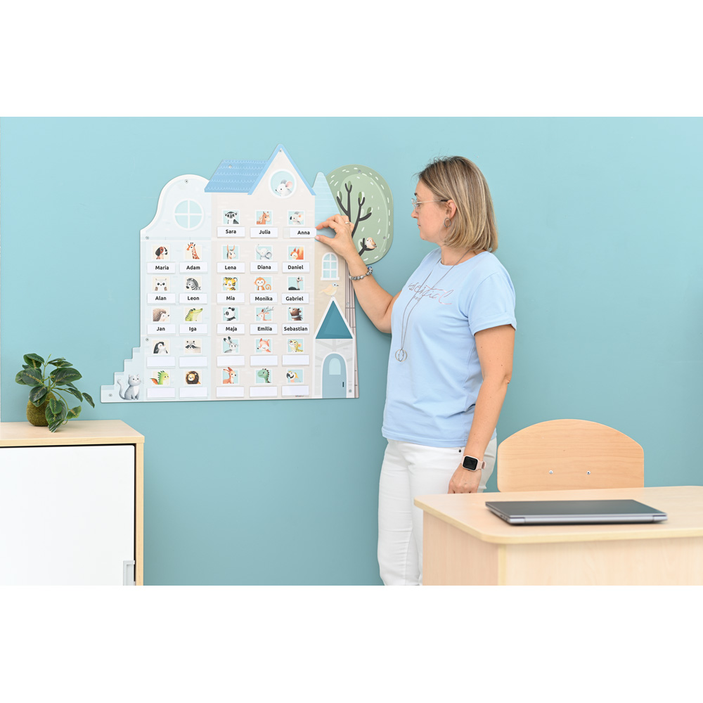 Eine Tafel in Form eines Hauses mit den Symbolen aller Kinder der Gruppe, bedruckt mit Motiven aus der Tierwelt. Durch ihr freundliches Aussehen passt sie perfekt in die Kindergarteneinrichtung.