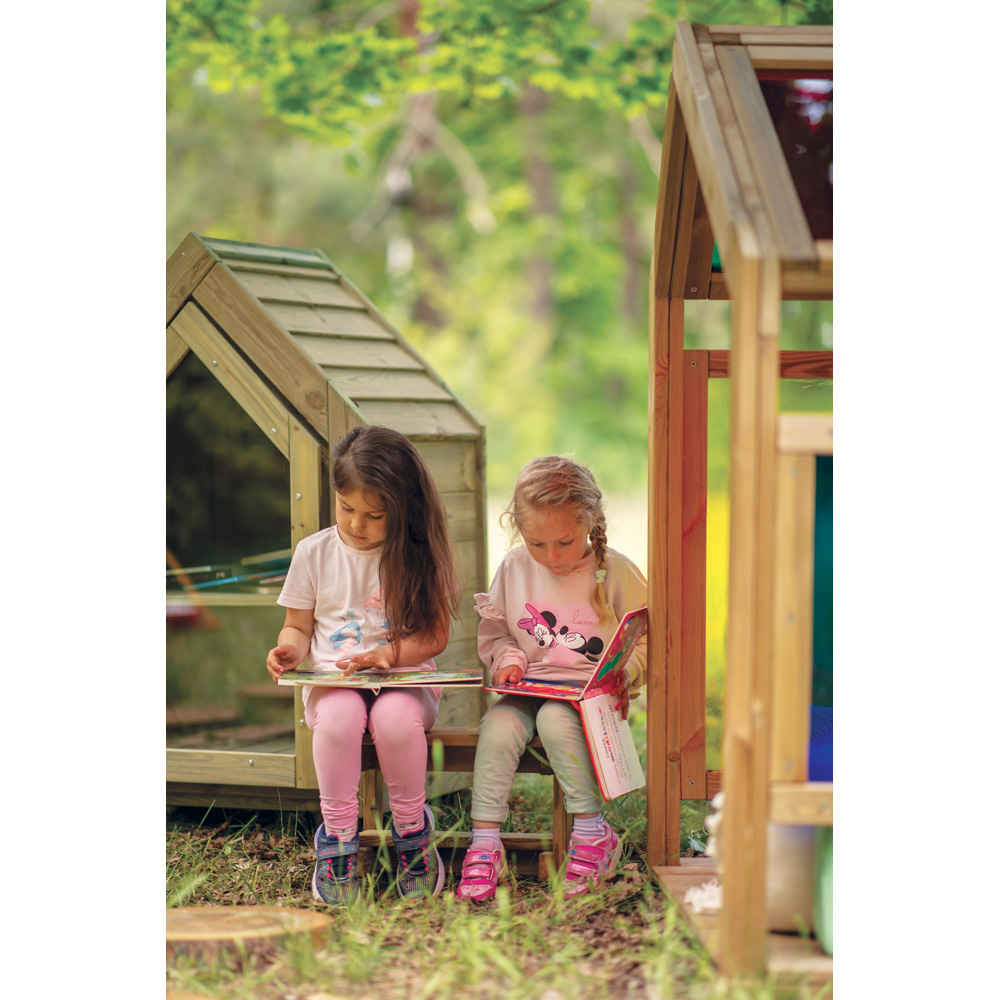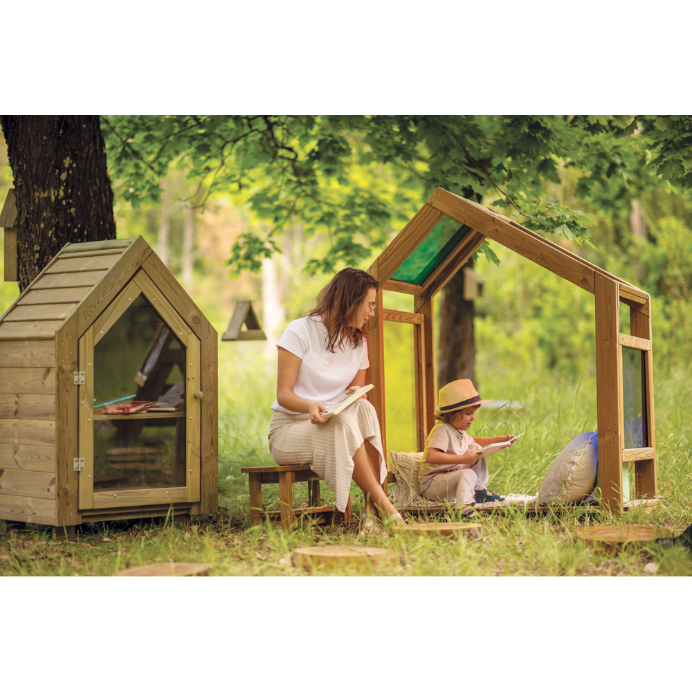 Auch kleine Tobegeister müssen sich mal ausruhen. Wenn dann ein schönes Buch zur Hand ist, kommt keine Langeweile auf. Das Terra Bücherhäuschen bringt die Bibliothek ins Freie. Hinter der Tür aus Acrylglas stehen die Bücher geschützt und dennoch sichtbar und griffbereit. Ein gemütliches Plätzchen zum Schmökern findet sich bestimmt in einem unserer Terra Häuschen (NV3372PZ-NV3374PZ, NV58601PZ, NV58609PZ). • Anzahl der Nutzer: 2 • Grundfläche: 79 x 56 cm • Sicherheitsbereich: 379 x 356 cm (Fläche: 11,5 m²) • Gesamthöhe: 128 cm • von 1 bis 14 Jahren