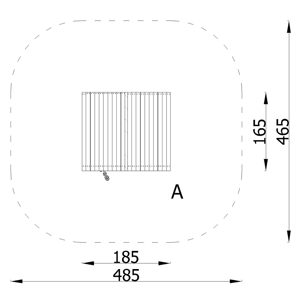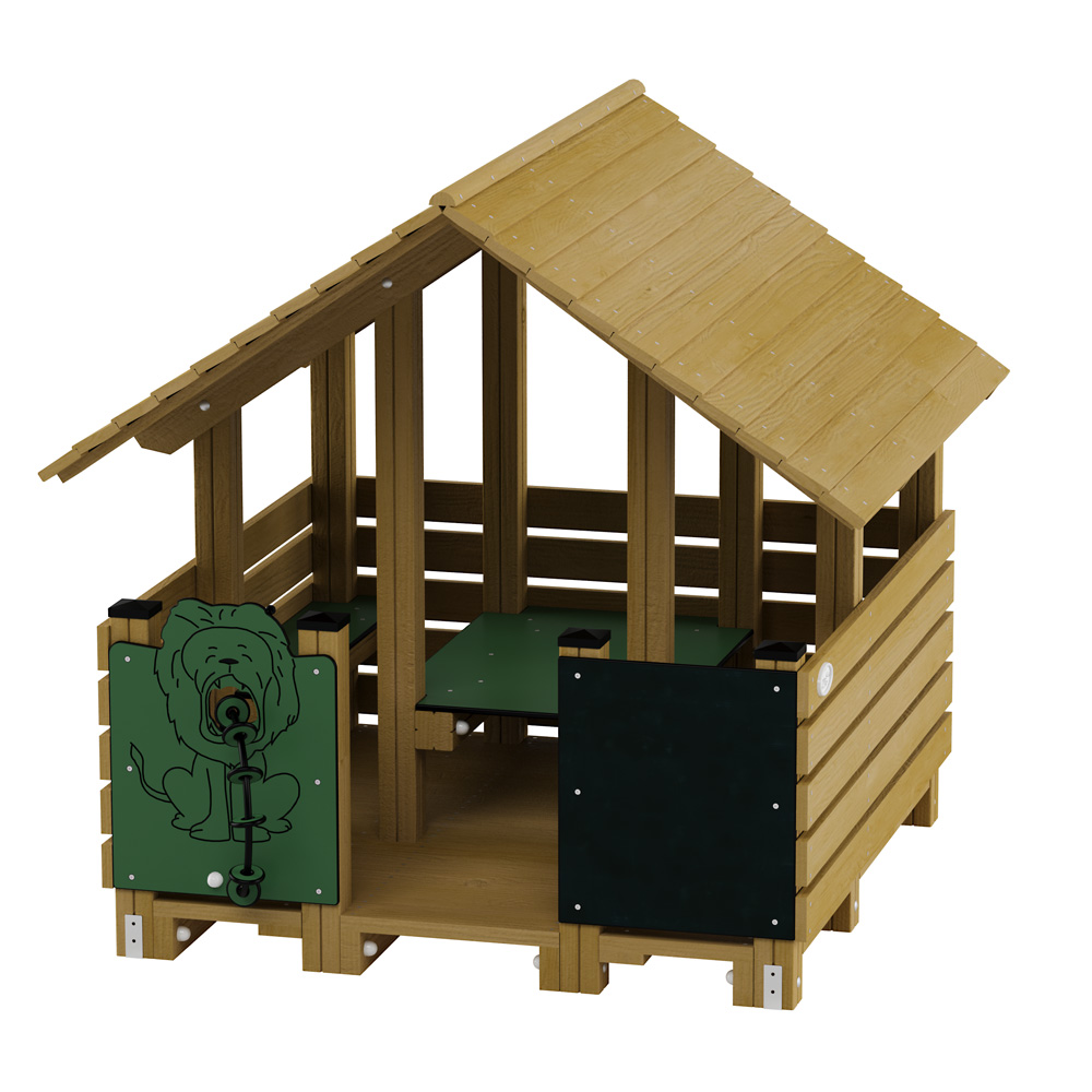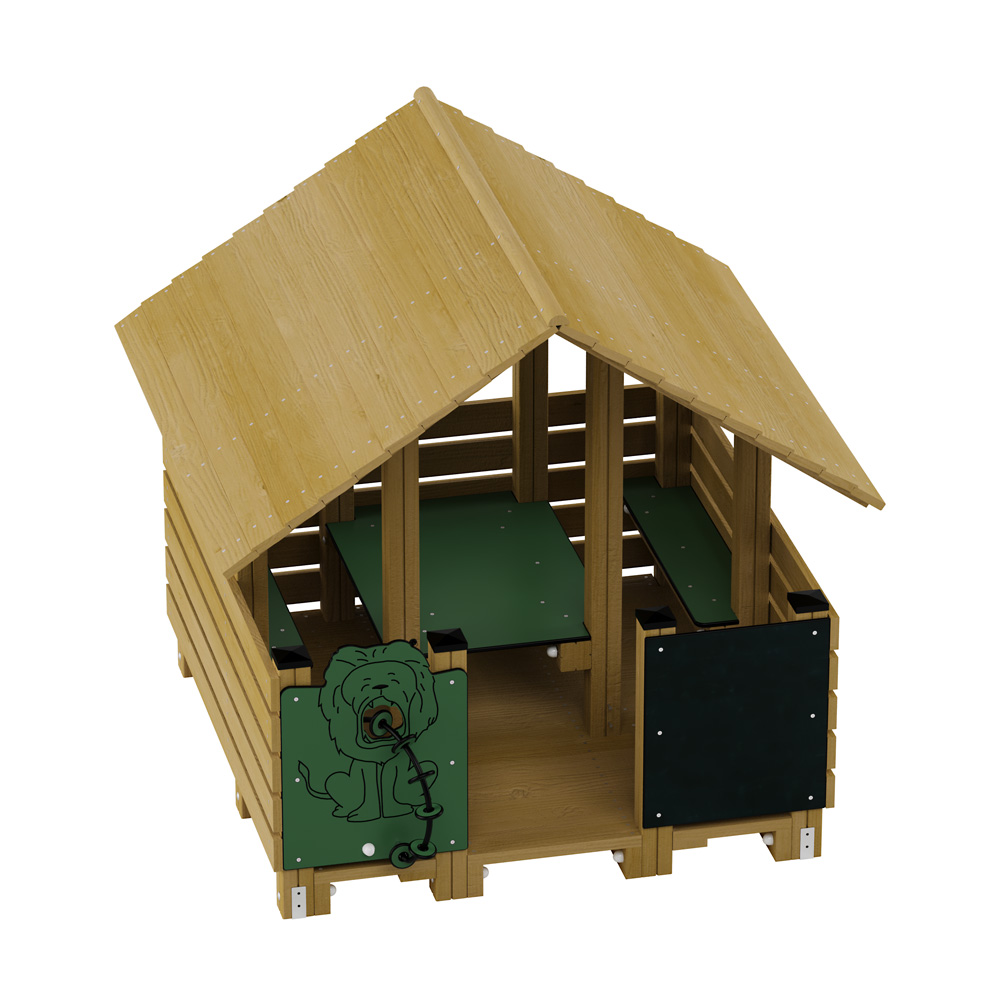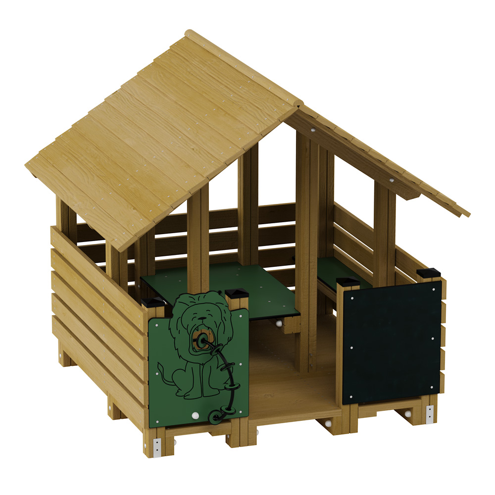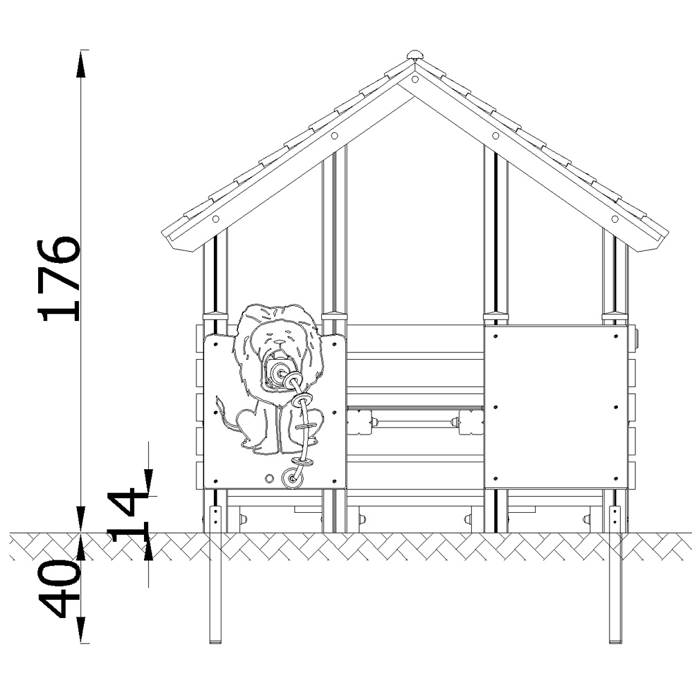 Das Häuschen ist ein toller Ort zum Spielen und Ausruhen und zugleich ein luftiger Schattenspender. Tisch und Bänke im Inneren laden die Kinder zum gemeinsamen Essen, Malen oder Entspannen ein. Eine Motorik- und eine Kreidetafel neben dem Eingang versprechen abwechslungsreiche Beschäftigung. Das Häuschen aus Naturmaterialien passt sich perfekt in jedes Aussengelände ein. Mit weichen Kissen ausgestattet und mit dekorativen Lichtern geschmückt wird es zu einer Ruheoase für die Kinder. • Pfosten aus Brettschichtholz Kiefer (9 x 9 cm), auf Pfostenschuhen aus Stahl, verzinkt und pulverbeschichtet - schützen das Holz vor Bodenkontakt • Anzahl der Nutzer: 8 • Grundfläche: 185 x 165 cm • Sicherheitsbereich: 485 x 465 cm (Fläche: 21 m²) • Gesamthöhe: 176 cm • max. freie Fallhöhe: 14 cm • Brüstungshöhe: 76/62 cm • Traufhöhe (Unterkante Dach): 103 cm • Eingangsbreite: 50 cm • von 1 bis 14 Jahren