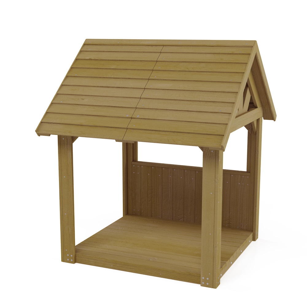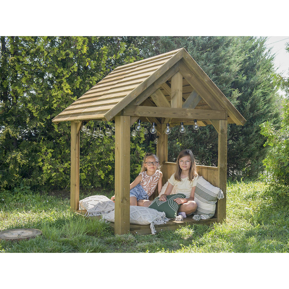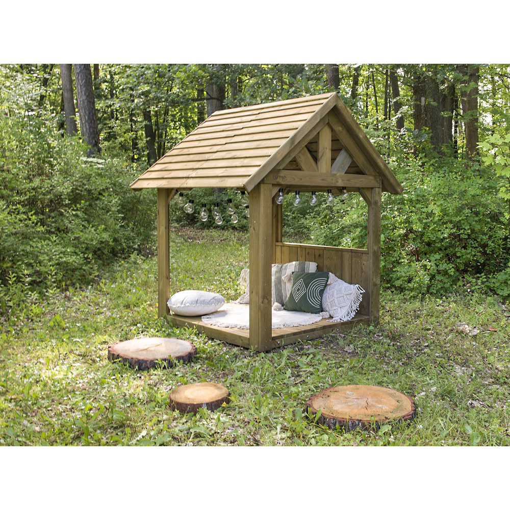 Das luftige Häuschen wird von natürlichem Licht durchflutet und bildet einen gemütlichen und doch offenen Raum zum Spielen und Entspannen. Es ist der perfekte Ort zum Lesen, Ausruhen oder kreativen Spielen und eine schöne Ergänzung für jeden Garten oder Spielplatz. Mit weichen Kissen, einer Decke oder einem Teppich ausgestattet und mit dekorativen Lichtern geschmückt, wird es zu einer Ruheoase für die Kinder. Durch passendes Fensterbrett oder Tafel (58107, 58108 - separat zu bestellen) verwandelt sich das Häuschen im Handumdrehen in einen Verkaufsladen, ein Cafe oder eine Schule.