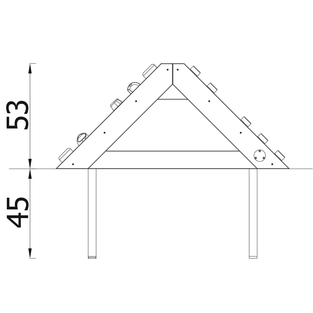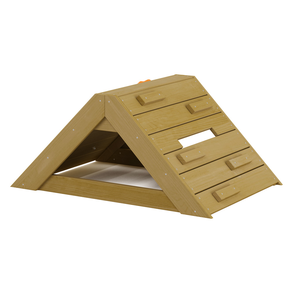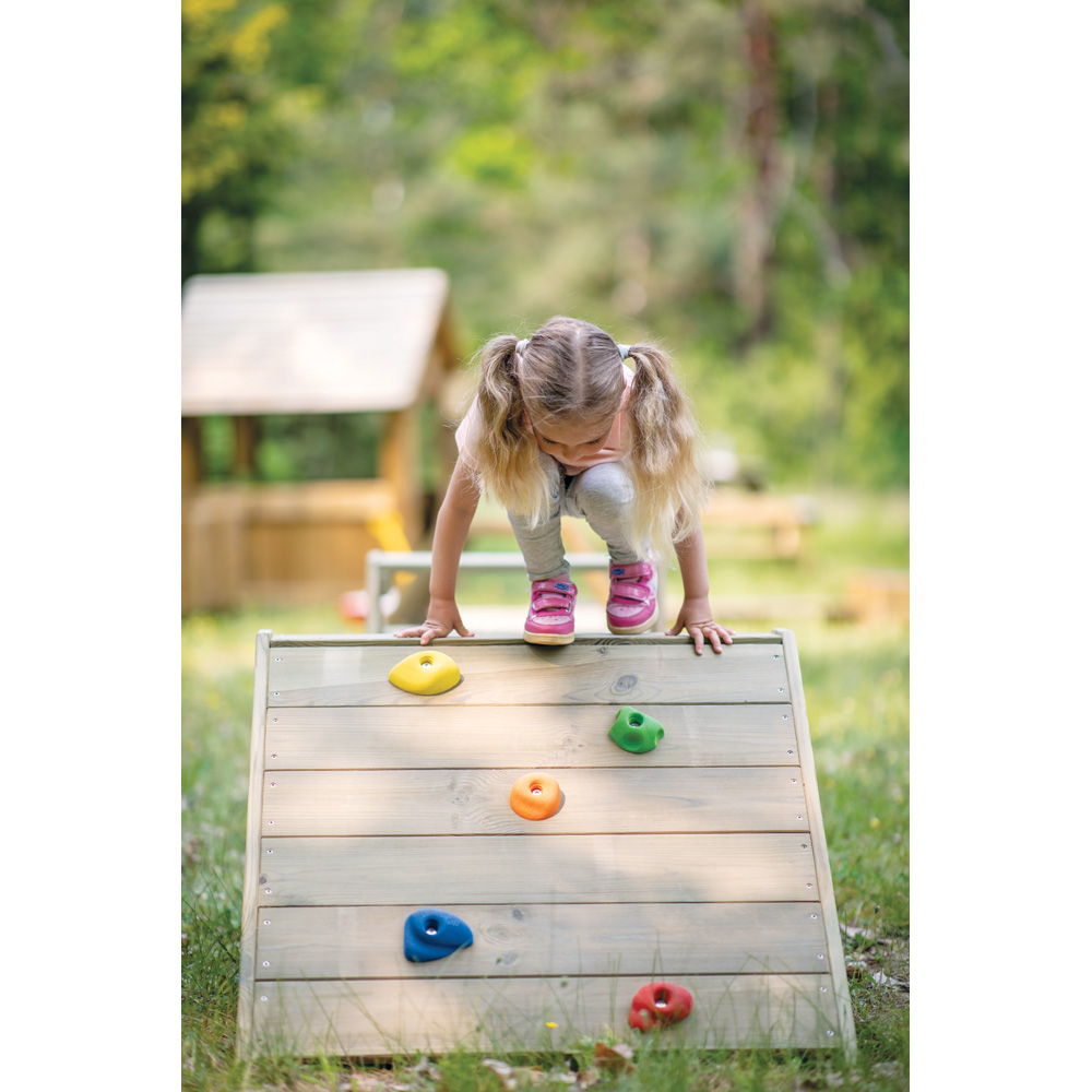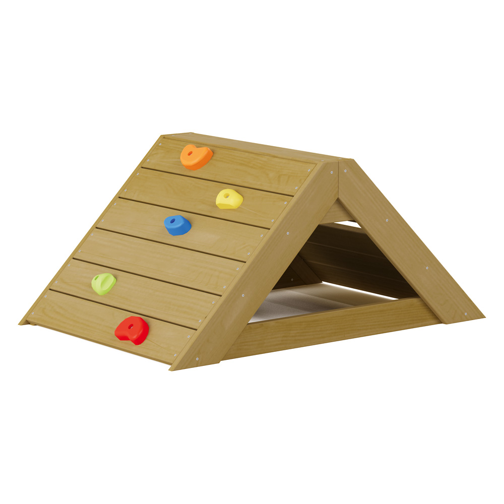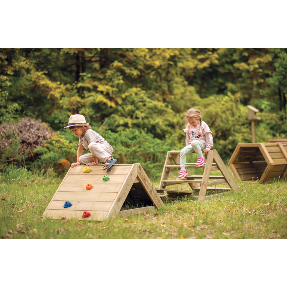 Die beste Grundlage für die kindliche Entwicklung ist Bewegung und Aktivität in der freien Natur. Mit unserer Terra Parcours-Reihe können Sie die Kleinen gezielt dazu animieren. Die schlichten, aber vielseitigen Geräte aus Naturholz fügen sich symbiotisch in die natürliche Umgebung Ihrer Einrichtung ein. Sie lassen sich beliebig miteinander oder mit vorhandenen Elementen Ihres Aussengeländes zu Hindernispfaden kombinieren, bilden aber auch einzeln spannende Spielstationen, die der Fantasie und Kreativität der Kinder viel Raum lassen. Das Kletterdreieck verlangt Geschicklichkeit und Planung, um sicher hinauf zu gelangen. Vorderseite mit Klettersteinen, Rückseite mit kleinen Holztrittleisten. Diese bietet auch die Möglichkeit, den Einhängesteg (NV58208PZ) anzubringen. • Anzahl der Nutzer: 2 • Grundfläche: 80 x 117 cm • Sicherheitsbereich: 379 x 417 cm (Fläche: 13,9 m²) • Gesamthöhe: 53 cm • max. freie Fallhöhe: 53 cm • von 1 bis 7 Jahren