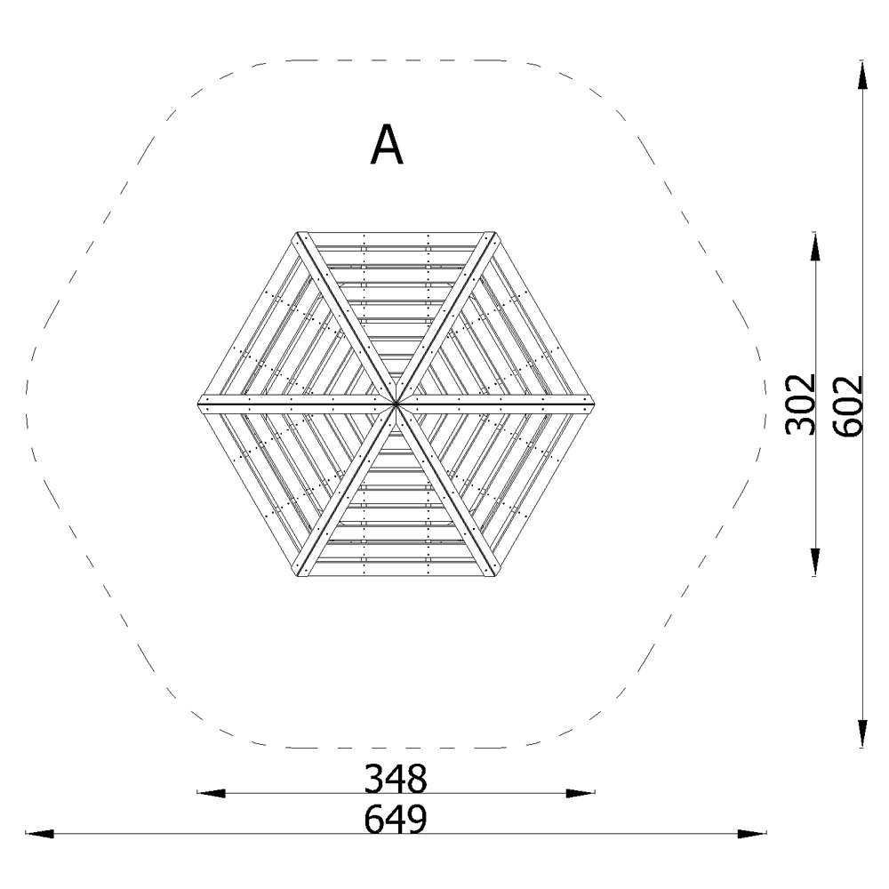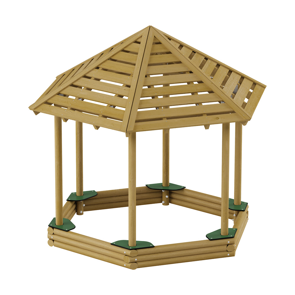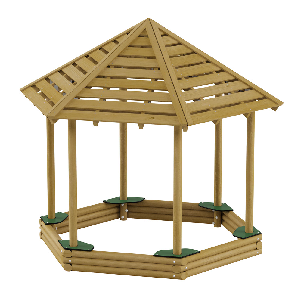 Der sechseckige Pavillon bildet einen wunderbaren Ort, um sich, geschützt vor zu viel Sonne, zum Sandburgenbauen oder einem kleinen Plausch zu treffen. Die Umrandung des Sandkastens ist mit kleinen Sitzen ausgestattet ist, die auch als Unterlage beim Sandkuchenbacken nützlich sein können. • Sitzflächen aus widerstandsfähigem HDPE • Sandkasten ohne Boden • fasst ca. 0,8 m³ Sand • Anzahl der Nutzer: 10 • Grundfläche: 348 x 302 cm • Sicherheitsbereich: 649 x 602 cm (Fläche: 30,7 m²) • Gesamthöhe: 300 cm • max. freie Fallhöhe: 29 cm • Traufhöhe (Unterkante Dach): 197 cm • von 1 bis 14 Jahren