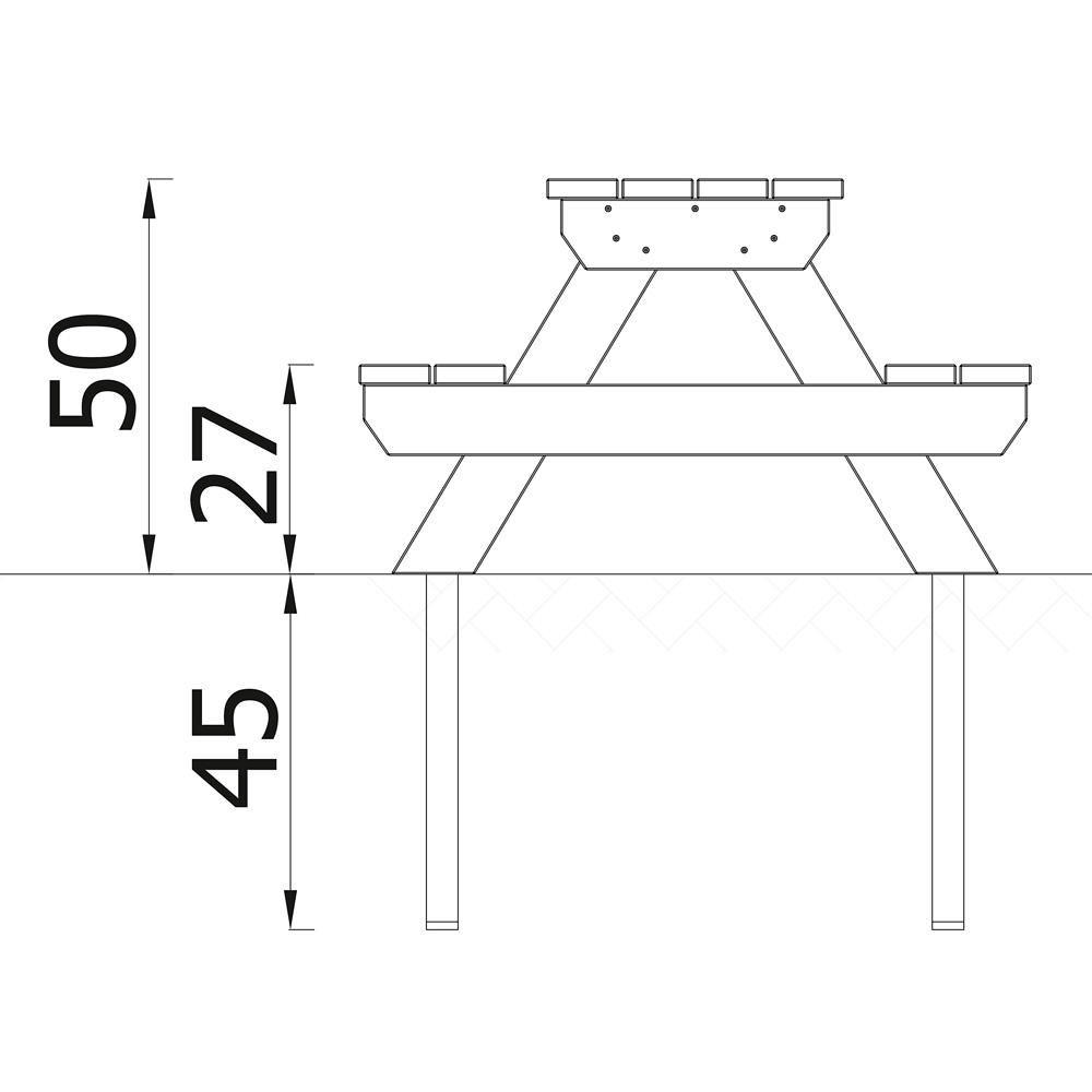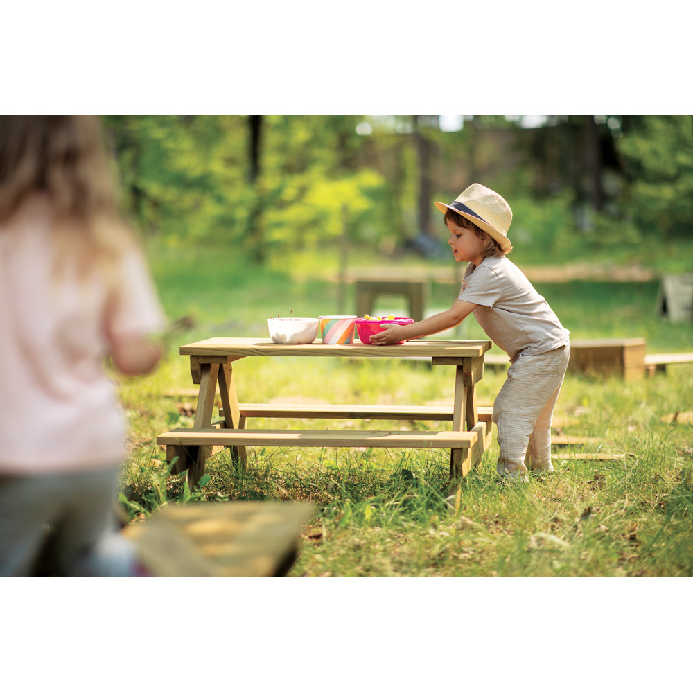 Die stabile Sitzgruppe für den Aussenbereich ist die perfekte Ergänzung zur Terra-Kollektion. Hier kann nicht nur das Picknick stattfinden, sondern auch eine kleine Spielrunde oder mit Naturmaterialien gebastelt werden. Die Sitzgruppe gibt es auch in einer Version mit Behältern unter der Tischplatte (NV58110PZ, separat zu bestellen). • Masse Tischplatte: B 90 x T 36 cm • Anzahl der Nutzer: 4 • Grundfläche: 90 x 85 cm • Sicherheitsbereich: 390 x 385 cm (Fläche: 13,1 m²) • Gesamthöhe: 50 cm • max. freie Fallhöhe: 50 cm • Sitzhöhe: 27 cm • von 1 bis 7 Jahren