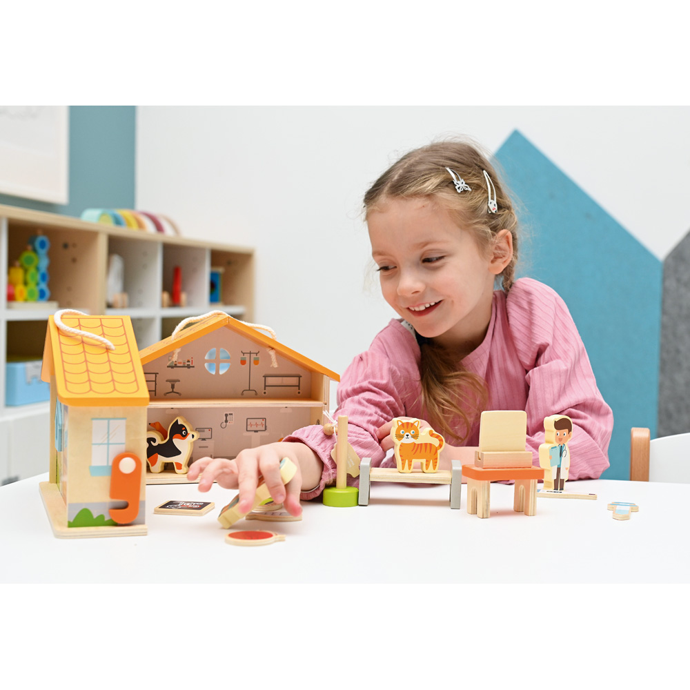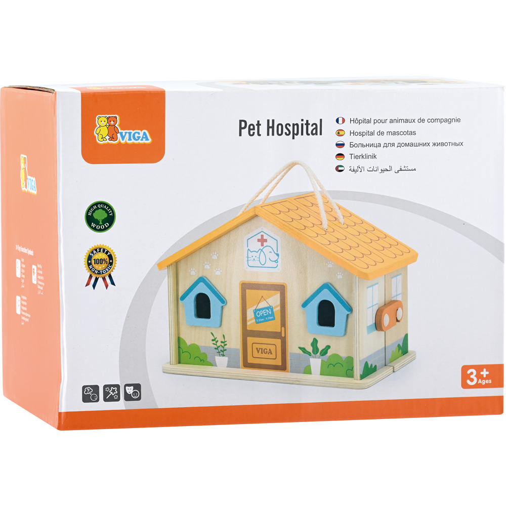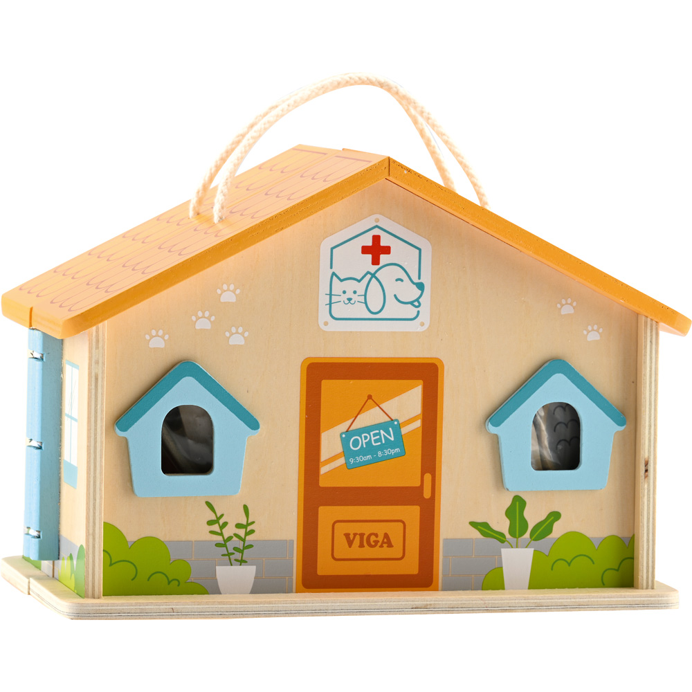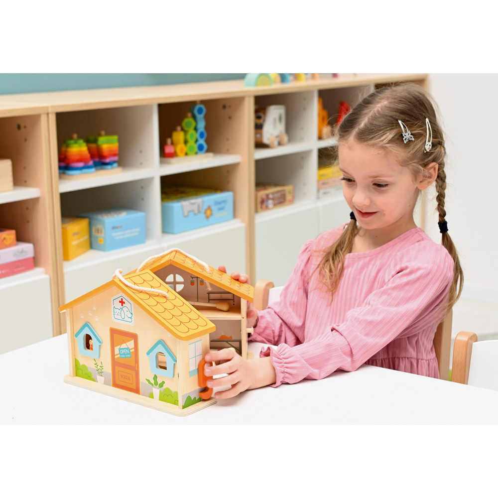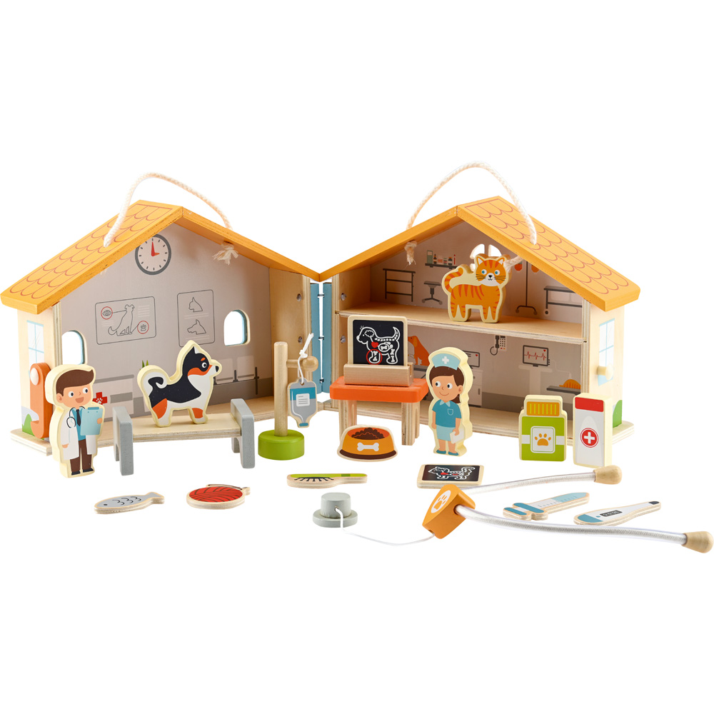 Tiere zu behandeln fördert das Einfühlungsvermögen. Klappt man die Klinik auf, findet man alles, was zu einem Tierarzt-Rollenspiel gehört. Nach dem Spielen können alle Teile in den Räumen der Klinik verstaut werden, um sie bequem aufzubewahren. Das Haus ist mit einem Griff ausgestattet, der das Tragen des Sets erleichtert. Das Rollenspiel fördert Sozialkompetenzen, Auge-Hand-Koordination, Vorstellungsgabe.