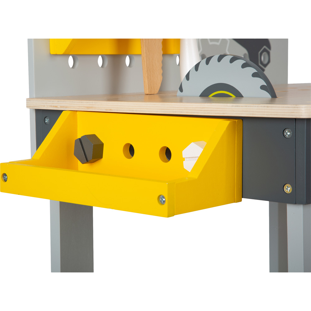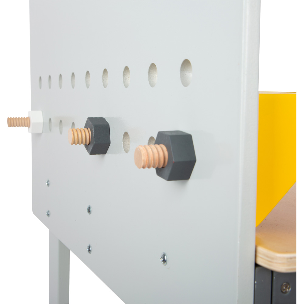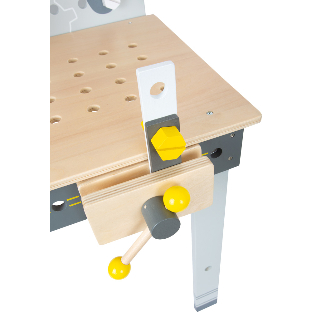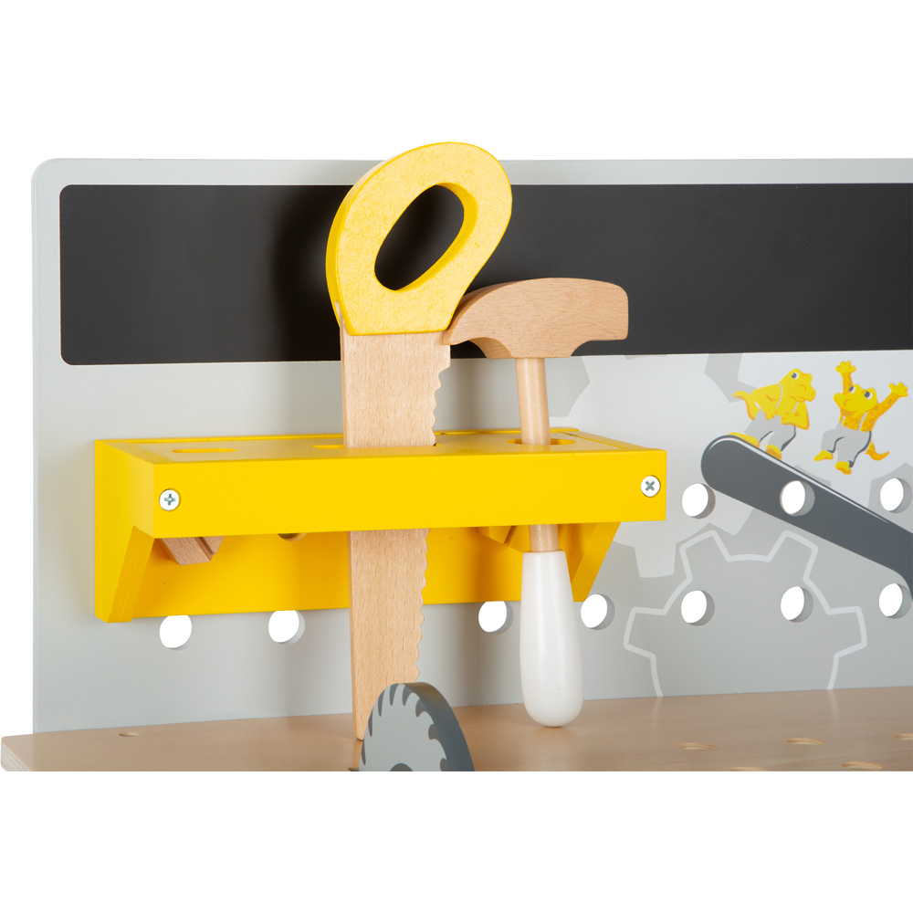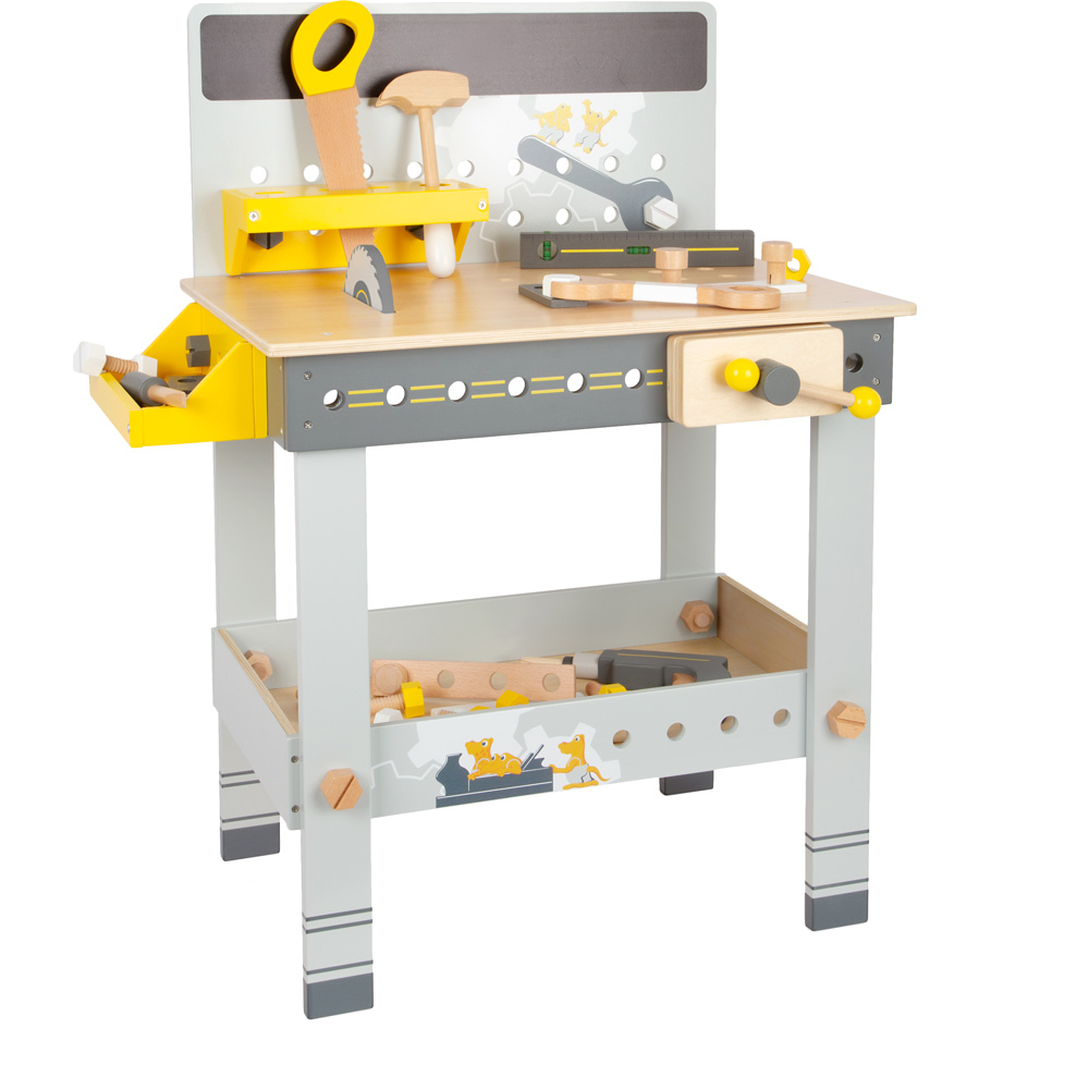 Sägen, Schrauben, Hämmern! Hier wird handwerkliches Geschick erprobt und die Feinmotorik geschult. Besonderheiten sind die integrierte Kreissäge, die Wasserwaage und der Akkuschrauber mit drei auswechselbaren Bits. Auf der beschreibbaren Tafelfläche können die neusten Bauprojekte skizziert werden. Je nachdem, wo die modularen Aufbewahrungskästchen angeschraubt werden, fungieren sie als Werkzeughalter oder Stauraum. Besonderes Highlight: Kinder können schon beim Aufbau der Werkbank mitwirken! Das perfekte Rollenspielzeug für kleine Handwerker!