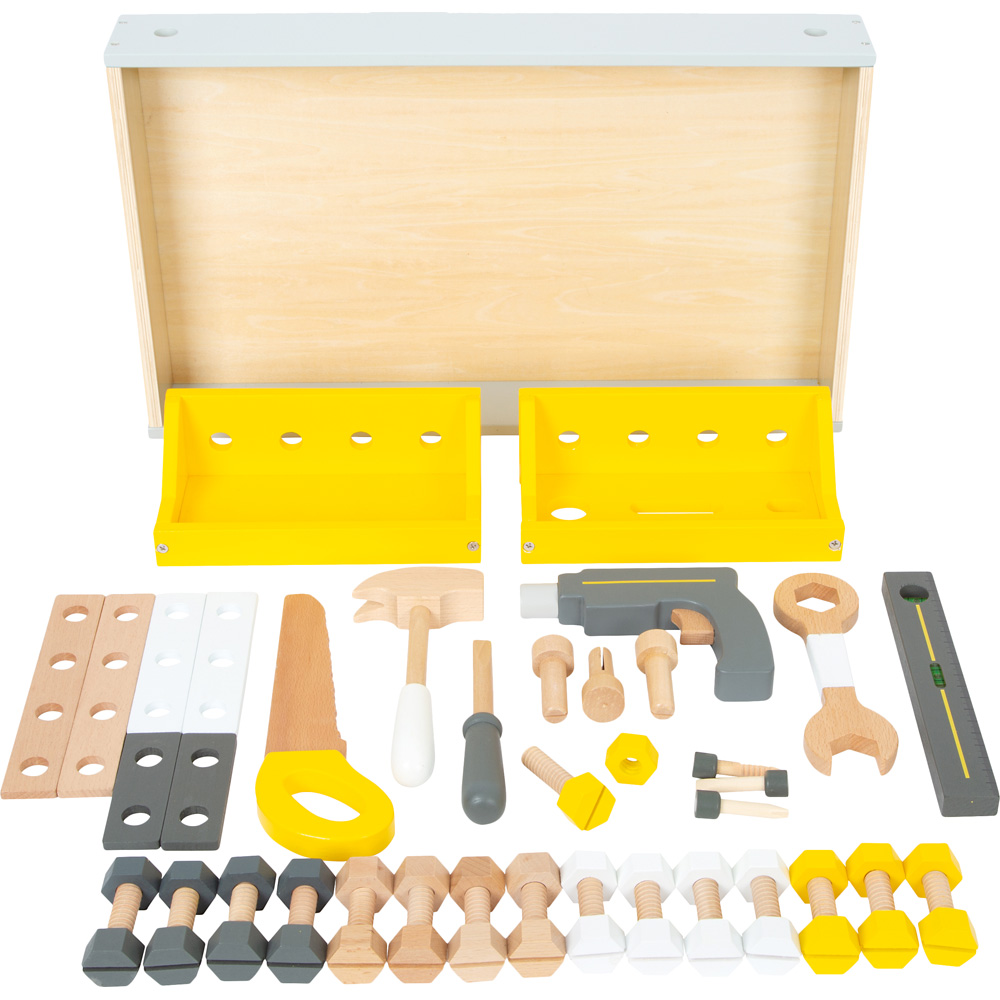 • 8 Werkzeuge mit umfangreichem Zubehör: 1 Kreissäge, 1 Akkuschrauber mit 3 Bits, 1 Wasserwaage, 1 Schraubstock, 1 Hammer, 1 Schraubenschlüssel, 1 Schraubendreher, 1 Säge, 2 anschraubbare Kisten, 6 Konstruktionsleisten, 16 Schrauben, 16 Muttern, 3 Nägel