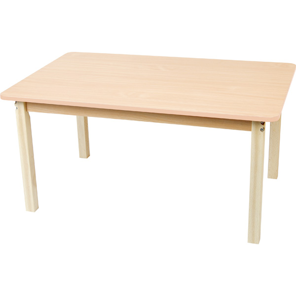 Tischplatten aus laminierter Spanplatte (18 mm) in Ahorn-Dekor mit farbiger Kante (2 mm, rot, blau, grün und gelb). Je nach Bedarf stehen unterschiedliche Tischbeine zur Verfügung (runde höhenverstellbar oder eckig mit fester Höhe) - separat zu bestellen.