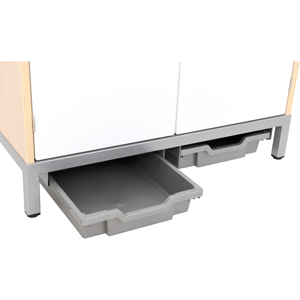 Aus laminierter Spanplatte in Ahorn-Dekor. Unter dem Schrank gibt es 2 flache Kunststoffbehälter als Abtropfauffang, silber.