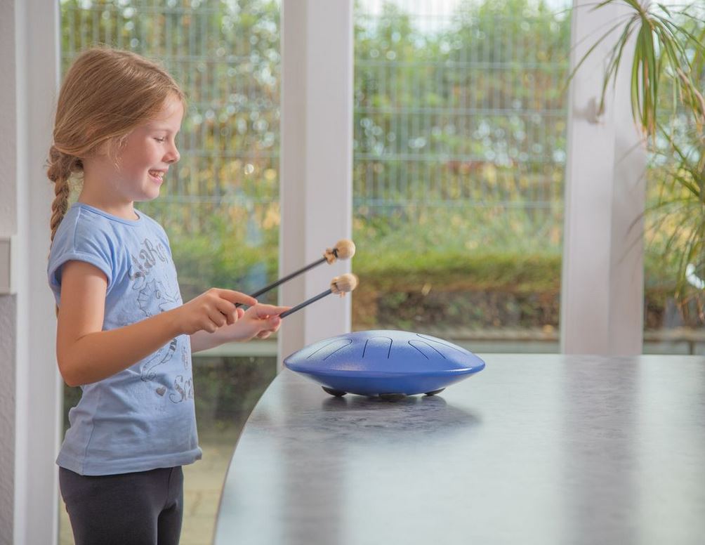 Das Spielen auf der Stahlzungentrommel fördert Feinmotorik, Auge-Hand-Koordination, Gehörbildung und Rhythmusgefühl. Durch die intuitive Anordnung der Zungen lernen Kinder spielerisch die Zusammenhänge von Klängen und Bewegungen kennen. Die beiliegenden Farbpunkte helfen, das Instrument mit farbigen Noten zu spielen, was den Einstieg erleichtert.